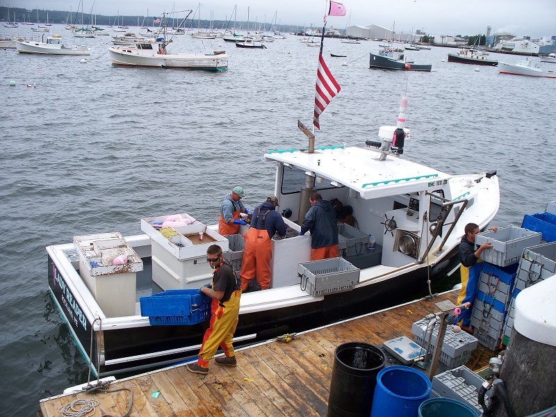 Normally, if I’m going to take a photo of dinner, it’s after the meal is ready and sitting on the plate in front of me. In keeping with the “locally grown” campaign that is prominent in grocery stores across Maine, here you see the before and after photos of the delicious lobster dinner that our friends Anne and Paul prepared for us. Because it was a Sunday afternoon, there were few fishing boats in operation but Paul knew exactly which dock to go to for fresh lobster. As you can tell, this boat has just arrived and the crew members are sorting their catch. The guy in the yellow slicker is slingling that blue crate with our six lobsters inside over to the scale to weigh them.