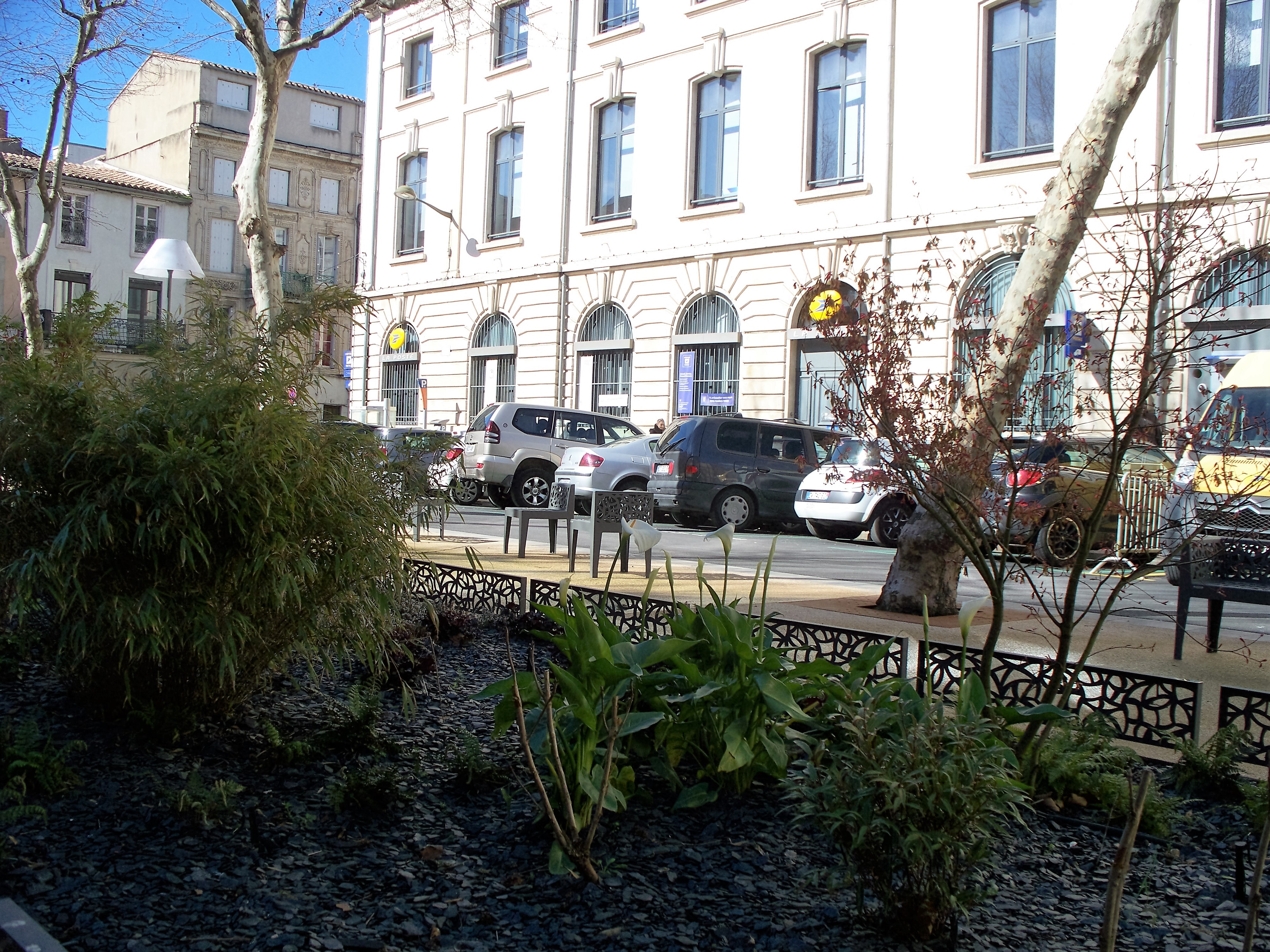 It was with trepidation that we went to the post office in Carcassonne for the first time. We had to go there because we needed to mail an initial contact letter into the immigration office in Montpelier so that they could schedule us for a physical exam and an interview. I know, sounds like fun in France, doesn’t it? There seems to be a universal dislike of post office practices worldwide and when you couple that with the insurmountable bureaucracy we’d read existed here, you can understand our dread. But then as we approached the building with the familiar blue and yellow La Poste logo, right in front we saw something else: a garden, a flower garden with benches and a water feature all newly installed. In fact, this haven of greenery replaced a parking lot. What post office does that?