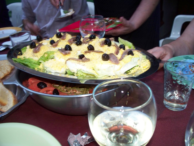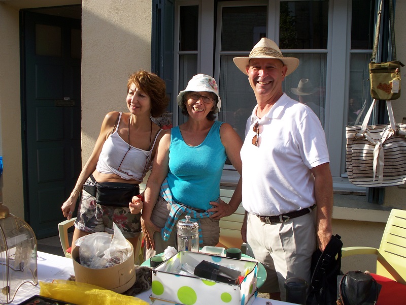 A few hours after that cheerful comment we noticed several people gathered in the street right outside our front door. We knew that there was an apéro (cocktail party) that evening but expected it to be in someone’s house or their back garden. Instead, the street got blocked, a line of tables was set up, and soon we were enjoying a glass of bubbly and platefuls of delicious starters, salads, main courses, and desserts with our neighbors, many of whom we had seen at the flea market. In some spots along the tabletops the food dishes had to be stacked because there wasn’t enough room for everything. Part of that might have been the dozen or so bottles of wine that were sitting out.