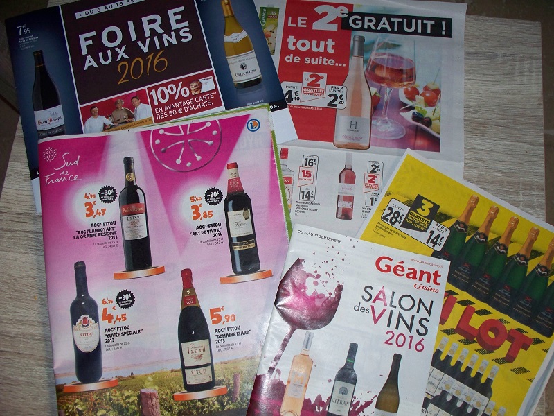 Twice a week our mailbox is filled with flyers from lots of businesses; both national chains and local businesses vying for our euros. These are called pubs, short for publicités that you and I might recognize with the English word “advertisements” that we could easily stop, but why spoil all the fun, especially at this time of year. It’s grape harvest time so every catalog that we receive is featuring wine. In the photo you’ll see just a few of the pubs that arrived today. Looks like we need to go shopping!
