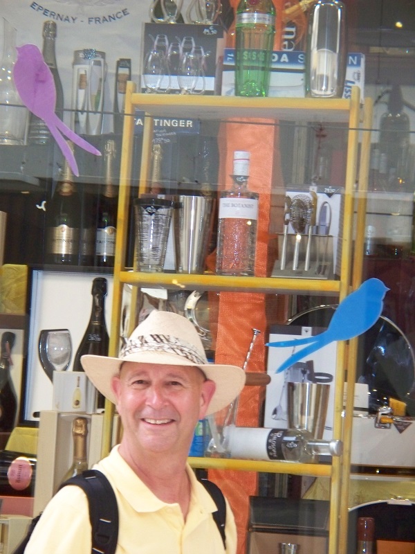 Now comes the real motivation for why we learned to look up. We had lived in Carcassonne for several months often looking without success for Bill’s favorite gin. Here he is standing in front of the shop window of the gourmet grocery mentioned earlier. If you look at the top of the window you’ll be able to see a prized green gin bottle just above his head. When I was learning to read in 1st grade, the book we used included the line: Look up. Look up, up, up. Who knew that Dick and Jane were so wise?