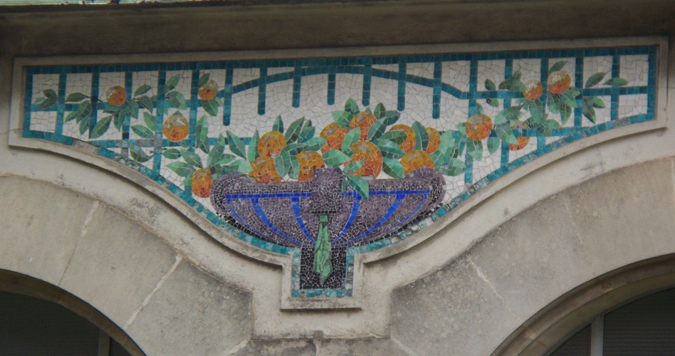 As I looked away and up from the shop window I saw a colorful harlequin decorating the corner building on the next street up. Thanks to the blog called Music and Heritage of Carcassonne I found out that this mosaic was created in the 1960’s to draw attention to a store with this jester’s name. So what else were we missing by looking just straight ahead? It didn’t take long to find a few more mosaics including this former bath and shower house from the 1800’s, the elementary school just around the corner from there, a butcher shop called Miquel, and a building supplies store.