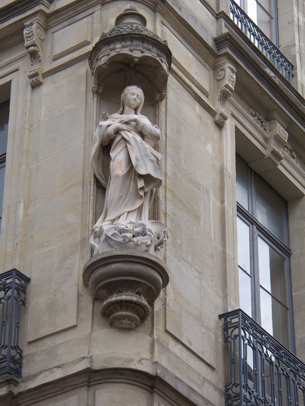 Although colored stones appear to have been popular for store fronts in the 19th century, monotone but no less impressive statues and carved faces adorn other buildings from the era. For example, the Virgin protects 2 cherubs above the entrance to the gourmet store La Ferme while inquisitive faces peer down at shoppers on the pedestrian street. Even downspouts and shutter holders are part of the wall art we find in town.