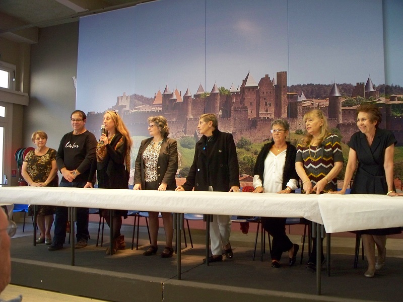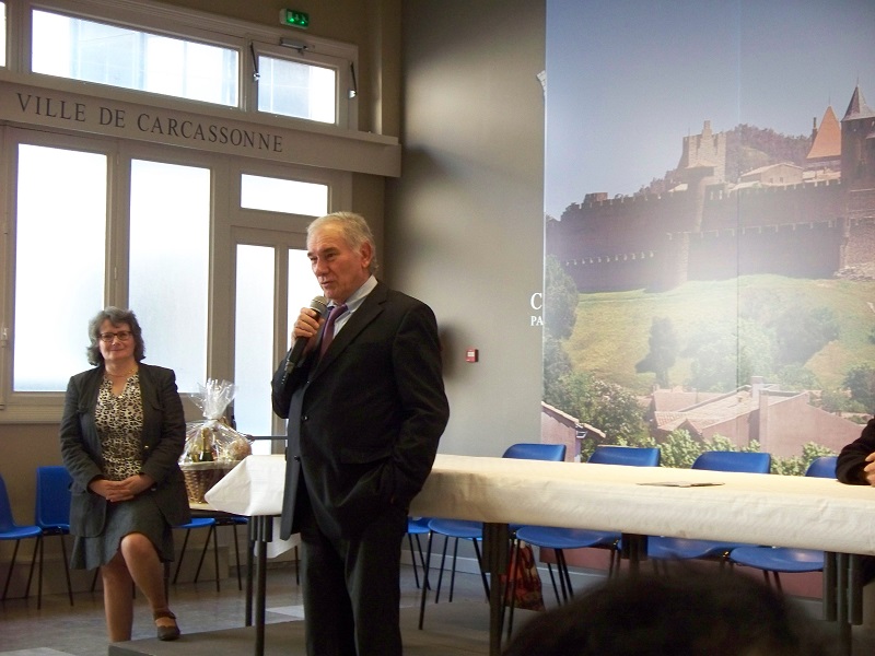 The mayor of Carcassonne is clearly proud of his city and we’ve run into him on numerous occasions when he has been acting in an official capacity or simply shopping at the Saturday market. As new residents of the city, we were invited by the AVF: Accueil des Villes Françaises (we think of it as the “Welcome Wagon”) to a reception sponsored by city hall and in the photo above you see the mayor addressing the audience. What you don’t see is earlier when all of us “newbies” had to stand in front with that same microphone and introduce ourselves to the crowd with details of where we were from, why we chose Carcassonne, etc. I guess our efforts at speaking French went well enough since afterwards a reporter wanted to interview us and around the amply-filled refreshments table many of the group’s volunteers talked to us about all of the cultural, social, and educational opportunities the AVF has to offer. I already attend a weekly conversation and grammar class on Fridays, Bill is probably going to start with a different class on Tuesdays, and we both are thinking about the frequent walking and historic tours available. These are all of the kinds of MEET-ings that we now like to attend.