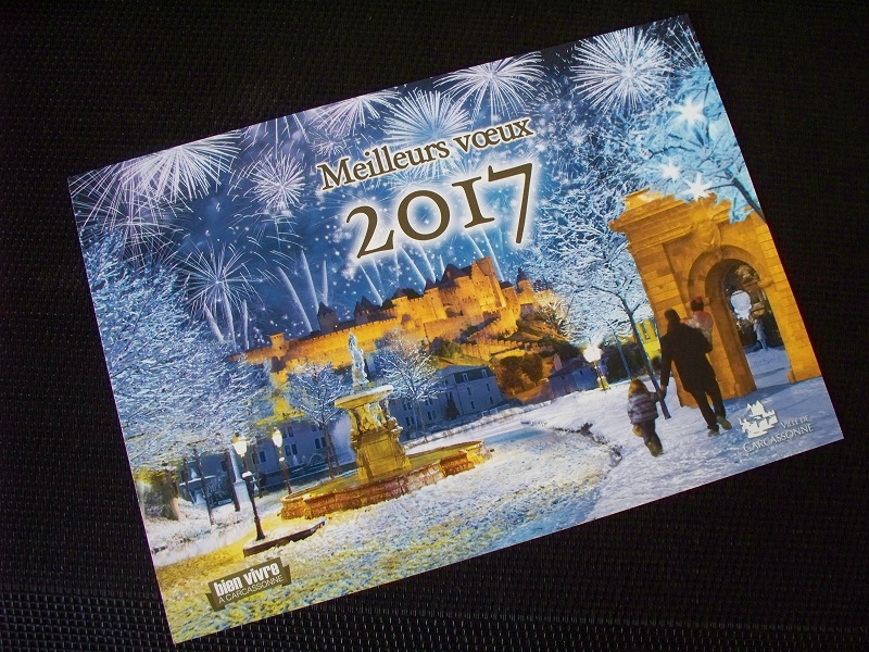 We got a postcard on Friday from the mayor that said Meilleurs Voeux 2017 that we might otherwise recognize as Best Wishes for the new year. On the other side of the card that you see here is his greeting wishing us a happy new year and thanking us for our confidence in him and in our city. In all of the places that we’ve lived, I don’t remember ever getting a card like this before—a tax bill, jury duty summons, or a zoning change, sure, but nothing nice like this. Looks like 2017 is getting off to a great start in Carcassonne!