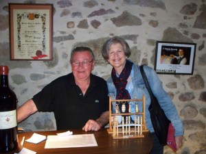 When friends Sally and Larry emailed us that they had an extra day of car rental left with nothing planned, we readily accepted their invitation to be “kidnapped” for a lunch somewhere out of town that would remain a surprise until we got there. Living in the middle of what we call “wine country”, it didn’t take long for the road signs to point to vineyards with the highly sought word degustation displayed meaning that tastings were available. About 30 minutes from our front door in the region called Corbieres Boutenac is Chateau La Voulte Gasparets where they produce the wine that was first described to us as the Rolls Royce of this area and has become our favorite. Owner and 7th generation winemaker Patrick greeted us at the door of his beautiful wine tasting room and then opened all 7 of the wines in his repertoire for us to try. As you can see in the photo, we came away with a case or two of that favorite plus several bottles of its white and rosé siblings.