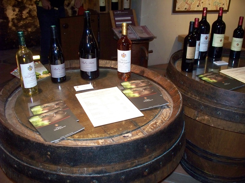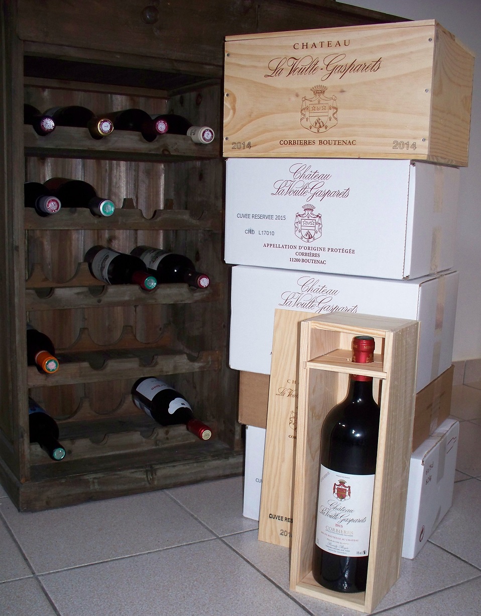 When friends Sally and Larry emailed us that they had an extra day of car rental left with nothing planned, we readily accepted their invitation to be “kidnapped” for a lunch somewhere out of town that would remain a surprise until we got there. Living in the middle of what we call “wine country”, it didn’t take long for the road signs to point to vineyards with the highly sought word degustation displayed meaning that tastings were available. About 30 minutes from our front door in the region called Corbieres Boutenac is Chateau La Voulte Gasparets where they produce the wine that was first described to us as the Rolls Royce of this area and has become our favorite. Owner and 7th generation winemaker Patrick greeted us at the door of his beautiful wine tasting room and then opened all 7 of the wines in his repertoire for us to try. As you can see in the photo, we came away with a case or two of that favorite plus several bottles of its white and rosé siblings.
