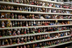 That ice rink is ringed by wooden huts filled with lots of traditional gifts found at similar markets all over Europe. One of those is Santos, tiny clay figurines representing workers such as bakers, butchers, cheese sellers, farmers, and chefs, all to be used to populate Christmas village scenes at home. With cool evening temperatures, naturally a popular item for sale is vin chaud or what we might think of as mulled wine. It definitely takes the chill off as you walk around town.