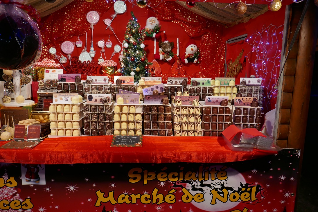 That ice rink is ringed by wooden huts filled with lots of traditional gifts found at similar markets all over Europe. One of those is Santos, tiny clay figurines representing workers such as bakers, butchers, cheese sellers, farmers, and chefs, all to be used to populate Christmas village scenes at home. With cool evening temperatures, naturally a popular item for sale is vin chaud or what we might think of as mulled wine. It definitely takes the chill off as you walk around town.