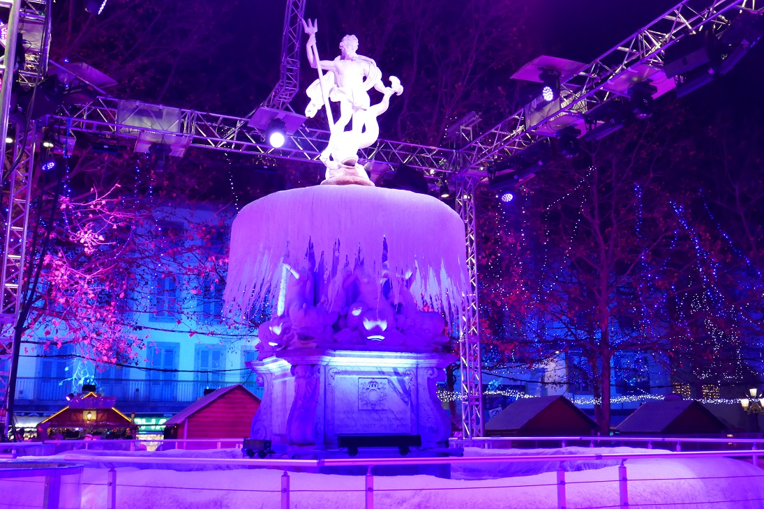 Next week I’ll write about our trip up north to Alsace to visit many of those Marchés de Noël but today the emphasis is on what we can find right here at home, a few minute’s walk from our front door. We’re accustomed to shopping for fresh fruits and vegetables on the town’s main square but for the month of December that huge space has been transformed into a giant skating rink. It seldom snows here but for about four weeks anyone with Olympic aspirations to be like Michelle Kwan or Scott Hamilton has the chance all within the gaze of the 18th century “frozen” statue of Neptune.