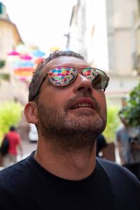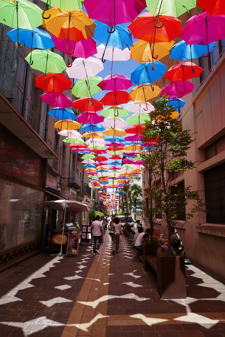 Now, about all of those umbrellas—there are 3000 of them that line about half a mile (800 meters) of the main pedestrian shopping street in the lower town, the Bastide. According to the newspaper, the idea got started in Portugal and has traveled as far as Tokyo with Miami being next on the list of installations. The mayor’s office here says that the exhibit is just to “catch the eye” of tourists and residents alike for the summer plus provide a bit of welcome shade to the well known mid-day sun in the south of France. We did exactly that by stopping at a sidewalk café, cooled by the umbrellas above, for a glass of chilled rosé wine. I’m pretty sure we’ll be going back there where, as the song from the movie says, “I will wait for you.”