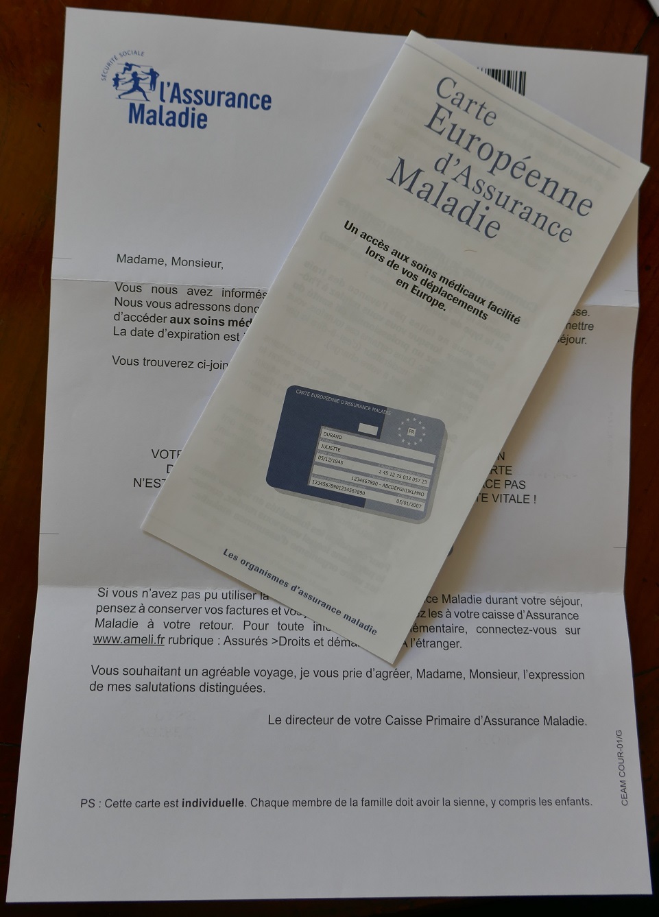 To apply, we printed out form 736 Demande d’ouverture des droits à l’assurance maladie and took it into our local CPAM (health insurance) office along with our residence card, birth certificate, electric bill for 3 months, and our banking information. These were the minimum requirements as printed on the back of form 736 but we also took form S3704 Déclaration de choix du médecin traitant, signed by our doctor, who in the US would be called our Primary Care Physician. We understand that other applicants have been asked for additional documents. As with every other government agency that we’ve worked with here, despite our far-from-perfect French, we were treated kindly, efficiently, and with respect. About a month later we each got a letter with the code required to initiate the opening of an online account. It’s a 2-step process to decrease fraud so 7 days after that another letter arrived with the second code we used to finalize the account and request our Carte Vitale and the European health card. In summary, it took about one month to get a letter confirming that we had been accepted into the national health system and then an additional month for our ID cards to arrive.