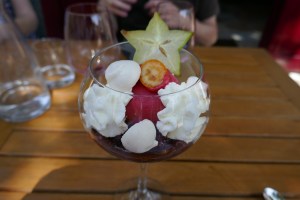 Lunch was easy to find since Sally had made a reservation in the same small town as the winery at La Luciole. We typically order whatever the chef suggests as the menu of the day and we were pleased once again. We started with either cauliflower tabbouleh or goat’s cheese salad followed by stuffed chicken thighs or fish cakes and desserts included a sumptuous red fruit cocktail you see in the photo.