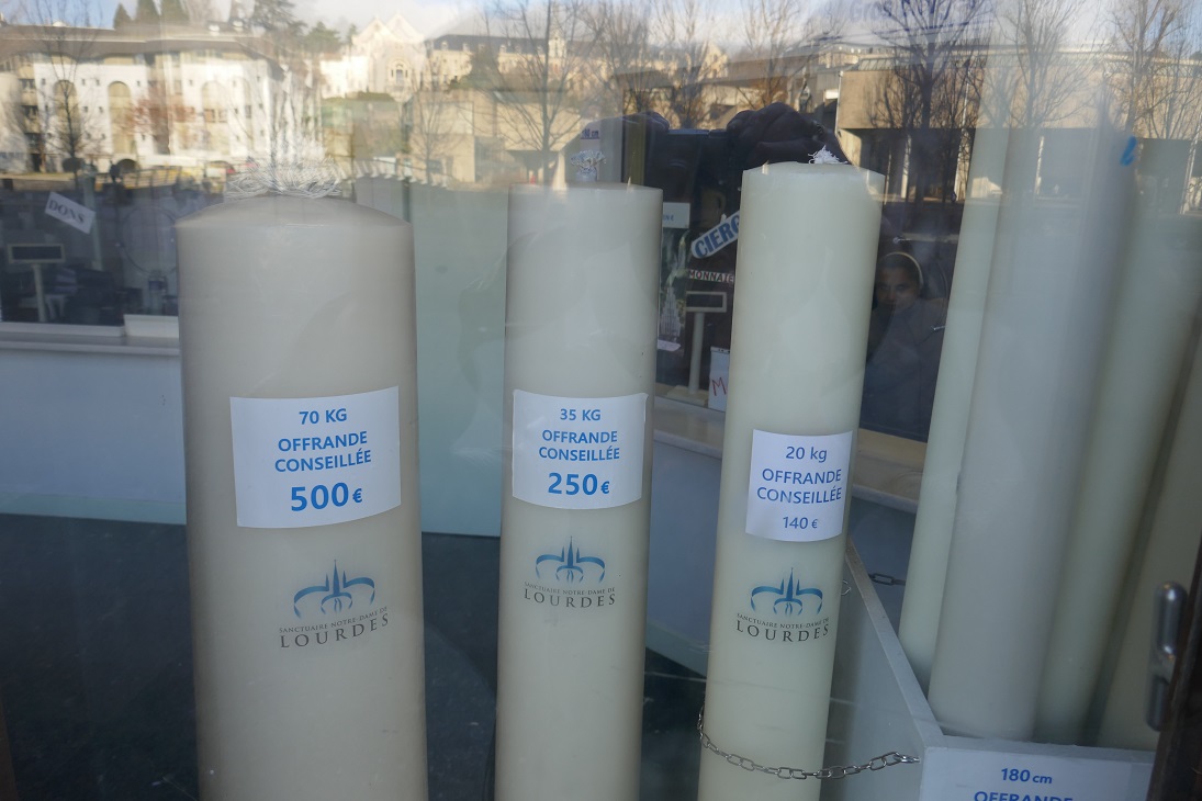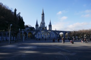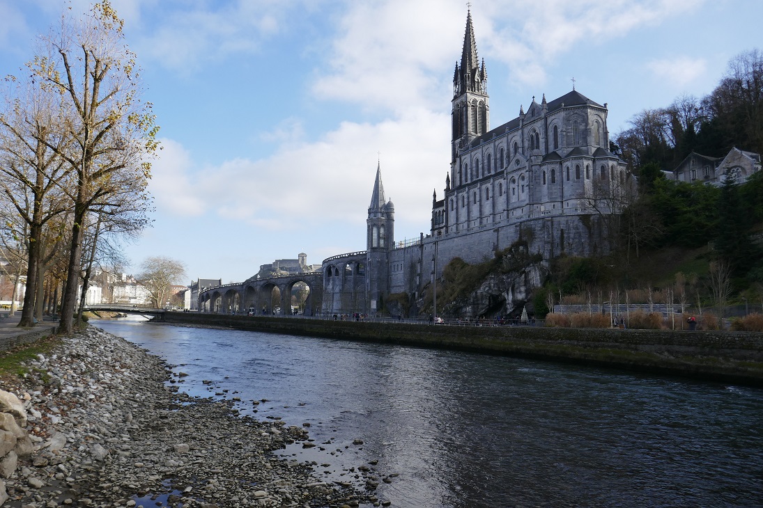 The French word for “heavy”, if you’re talking about feminine nouns is lourdes which is exactly the same spelling as the town in the Pyrenees that is a major pilgrimage site for Catholics. According to legend, Bernadette Soubirous saw an apparition of the Virgin Mary there in 1858 and believers soon started arriving at the cave (grotto) hoping for a cure. Although I have long wanted to visit the town for its historical significance, Bill said that it would “take a miracle” to convince him to go. Given that today’s blog post was supposed to be about our planned but now postponed side trip from Bordeaux to Cognac because the tasting rooms weren’t open during the holidays, I’d say that we achieved that lofty goal. Hop aboard the train with us for our next destination: Lourdes.