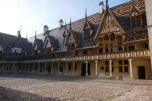 By 1443, this part of France had long suffered from the 100 Years’ War with England. To help the people within his territory the Duke of Burgundy had a hospital/hospice built with a church in the center so that even bedridden parishioners could attend services. We found the most striking aspect of the building, however, to be outside. Similar to the roofs of many mansions we had seen in Dijon, red, yellow, green and brown glazed tiles are laid in geometric patterns after being fired 3 times to provide protection from the elements for up to 300 years.