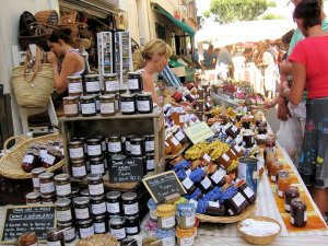 As we approached St. Rémy de Provence it was clear that this was the Wednesday market day, their busiest day of the week. We had to search a bit for a parking spot but it turned out to be well worth the wait. The town population of less than 10,000 must double at times like this, attracted by hundreds of stalls and vendors stretched along winding streets surrounding the main square. Regional products abound such as soaps, lavender, cheese, and oil. Bill found beautifully carved salad spoons from olive wood while our friends picked up an array of colorful ceramic and wooden art pieces for their home. It was a rather misty morning, not great for picture taking, so the market photos you see here are courtesy of the tourist office.