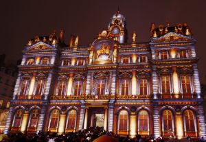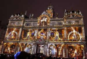 In December 1852 the residents of Lyon were looking forward to the installation of a tall statue of the Virgin Mary on Fourvière Hill overlooking the city. When that didn’t happen as scheduled, disappointed homeowners placed candles in colored glasses on their windowsills to brighten the dreary winter evenings One hundred years later the trend caught on with shop owners, followed by the city government that began to highlight historic buildings with floodlights that lit up entire districts. Initially these were static lights that simply embellished the monuments but in 2004 artists were encouraged to use these buildings as huge backdrops for annual “sight and sound” shows and we got to attend that this week.