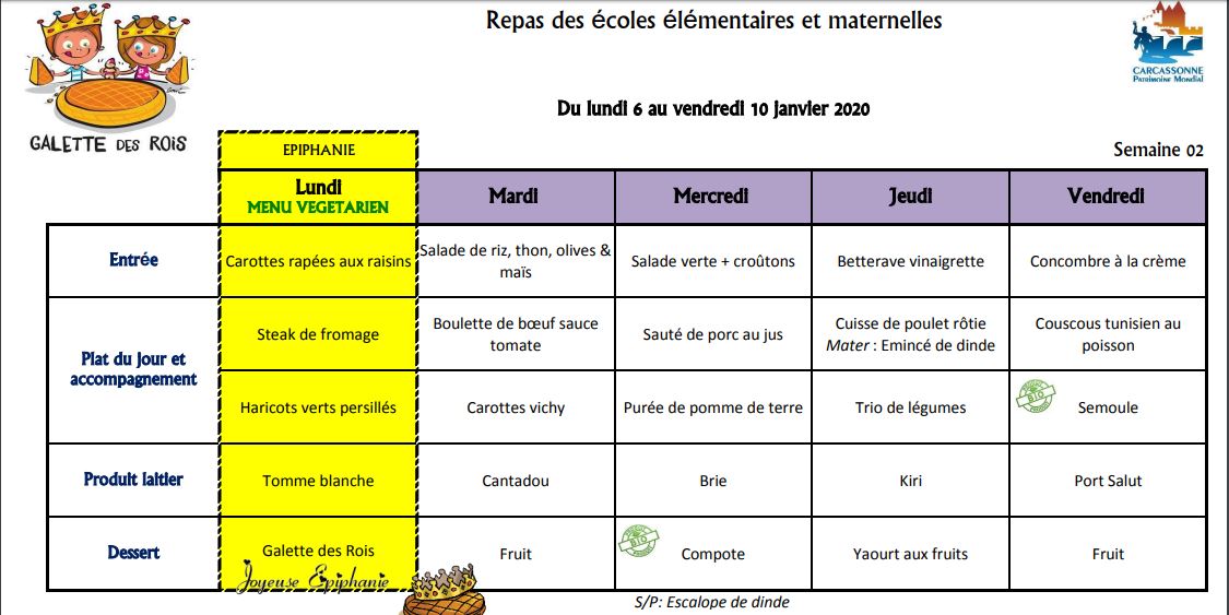 French school cafeterias have begun a 2-year experiment to offer an all-vegetarian meal once a week to their students. The evaluation will include the impact on student health, food waste, and the cost of meals. Lunch prices are based on the family’s ability to pay and range in price in our area from 1.67€ to 4.97€ per child. The menu below is from earlier this year showing the first of those non-meat choices. It still amazes us, as noted in our blog post from 2018 , that school lunches include a salad starter, the main course, a cheese plate, and dessert of fruit and/or yogurt. I read about one Australian mother who was delighted that her young daughter was learning table manners and how to appreciate food in a civilized manner at school. Her American husband, equally pleased, remembered the offerings at his school where fast-food chains offered pizza, submarine sandwiches, and sloppy joes.