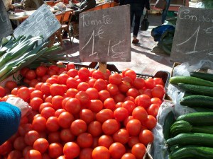 Although Bill and I aren’t vegetarians, it would be easy (and inexpensive) to do so given our access to the huge variety of fresh fruits and vegetables available to us at the 3-times-a-week open air market. Living in a city surrounded by farms and only 50 miles, as the crow flies, from the Spanish border helps a lot. I still remember an email from 5 years ago from former Carcassonne residents Tracy and Alan who said that they regularly bought 10 kilograms (22 pounds) of fruits and vegetables for 10 euros (12 dollars) at the market. Every Saturday morning we do the same thing leaving us with the happy dilemma of how to eat all of that before it’s time to return to the market the following week.