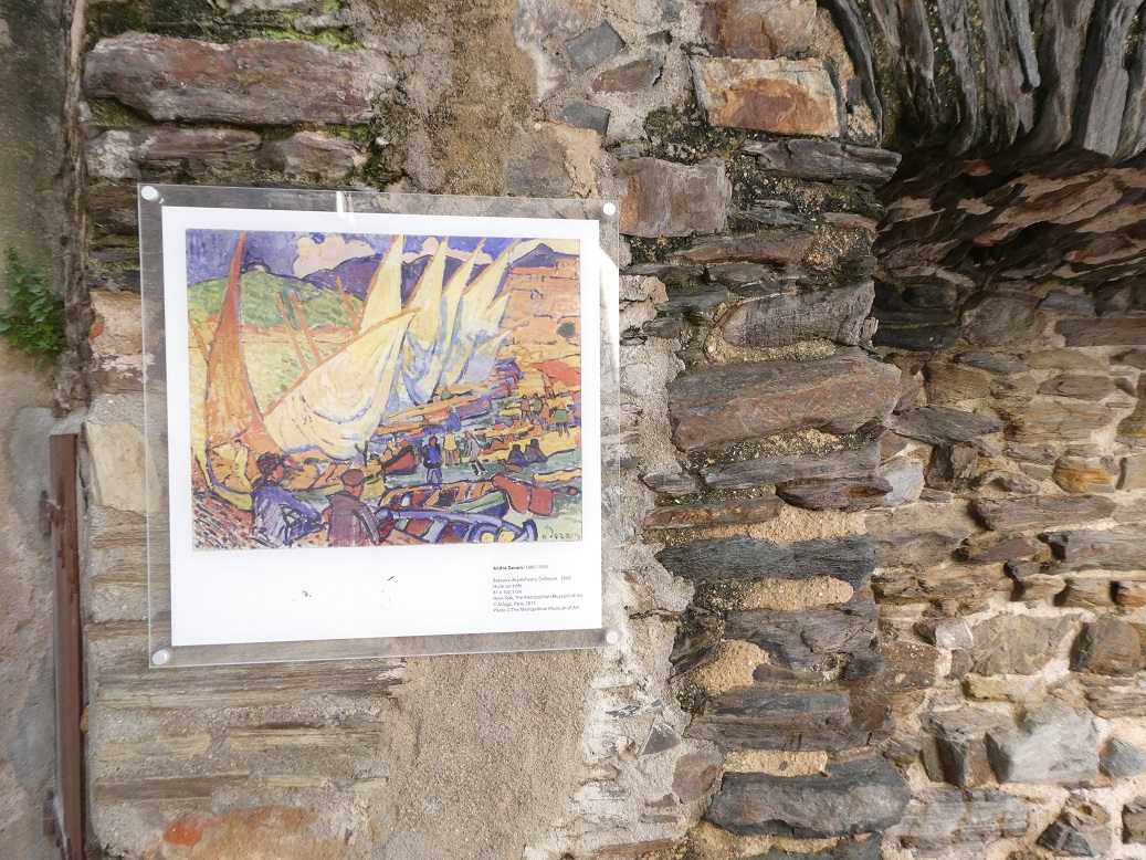 Right behind the church is the Mouré District (Quartier du Moré) where one blogger said you should go if you were looking for “charm and romance”. I understood that statement once we started wandering the paving stoned streets and saw the narrow, vine and flower covered former houses of winemakers and fishermen. Art studios and galleries display prints and other works inspired by Henri Matisse who arrived in Collioure in 1905 and developed Fauvism (in French, fauve means “wildcat”) that used strong colors with emotions to match. A self-guided walking tour takes you past many spots in town where Matisse and other artists created their original works.
