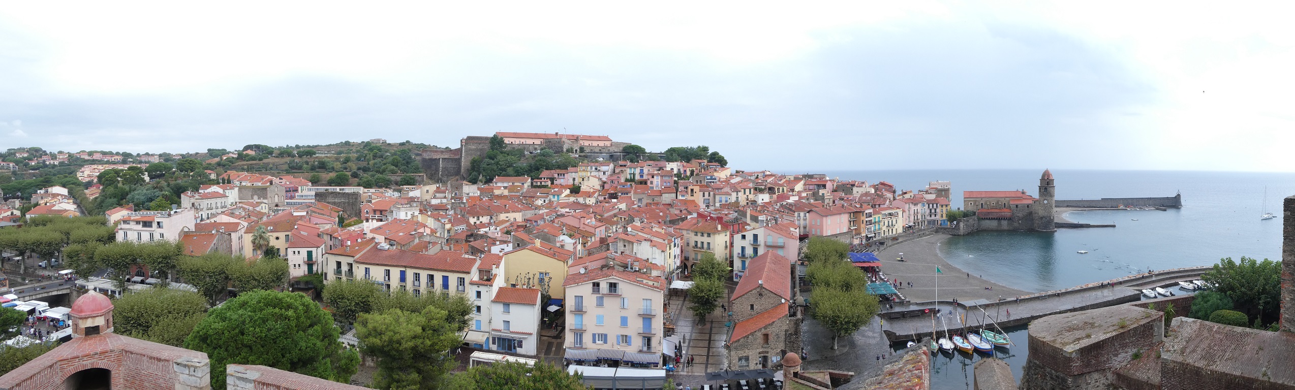 Earlier this year during the 2-month lockdown, or perhaps even more descriptive in French, la confinement, our desire to travel never lost its appeal. After all, our vacation plans for both April and May fell victim to the virus but that simply gave us more resolve to try again as soon as it was reasonable to board the train for another adventure. Those two trips had each been several hours away, and we’ll reschedule them later, but one destination less than 100 km (60 miles) from Carcassonne, as the crow flies, really caught our attention for this first venture out closer to home. It didn’t take much convincing once Bill showed me the view from the apartment that you see above accompanied by those magic words: by the sea. Off we went to Collioure.