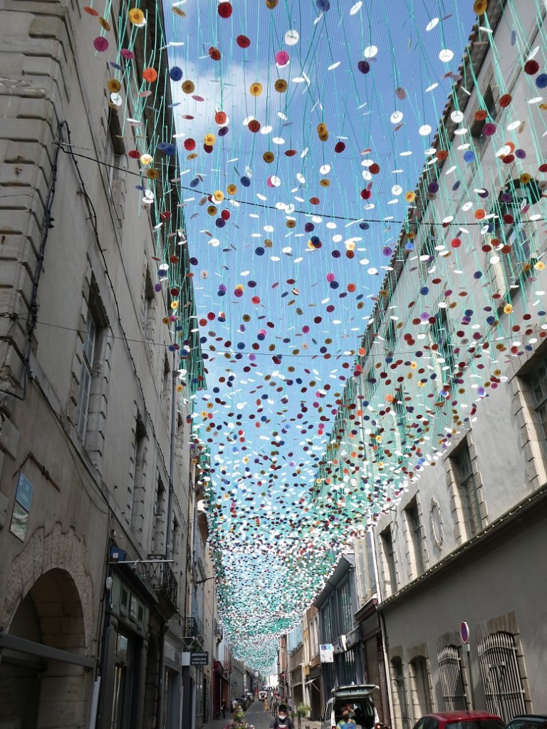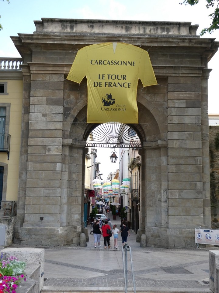 In its 118 year history, the Tour de France has made an overnight stop in Carcassonne 10 times, twice since we’ve lived here and this weekend made the third. The city has been making preparations for the arrival for months and the most recent evidence of this was the installation of umbrellas (photo above) in the official race colors of solid white, yellow, and green, plus white with red polka dots all along the main pedestrian walkway through the middle of town. These provide a nice bit of shade from the summer sun plus lend even more cheer to the festivities. Running perpendicular to that, the principal driving street was not left out since it boasts an endless stream of dangling flowers well above the car roofs. All was in place by the time the first of 168 riders rolled over Friday’s finish line having made the 220 km (137 miles) trip from Nîmes in about 5 hours.