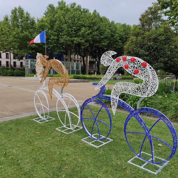 Those last two items intrigued me since I hadn’t really thought about who pays for all of this, assuming that it was the commercial sponsors who have substantial advertising fees. Host cities, according to one of our local papers, pay 80,000 € as a departure city and 120,000 € as an arrival city. The Tour promoters say that a return of 2 € to 3 € can be expected for each euro invested and a study undertaken by the city of Albi in 2019 when they were a city of arrival, of a day of rest, and of a departure, that figure rose to 9 € for each euro invested. It seems that this sporting event is definitely a boom for hotels, restaurants, and shops.