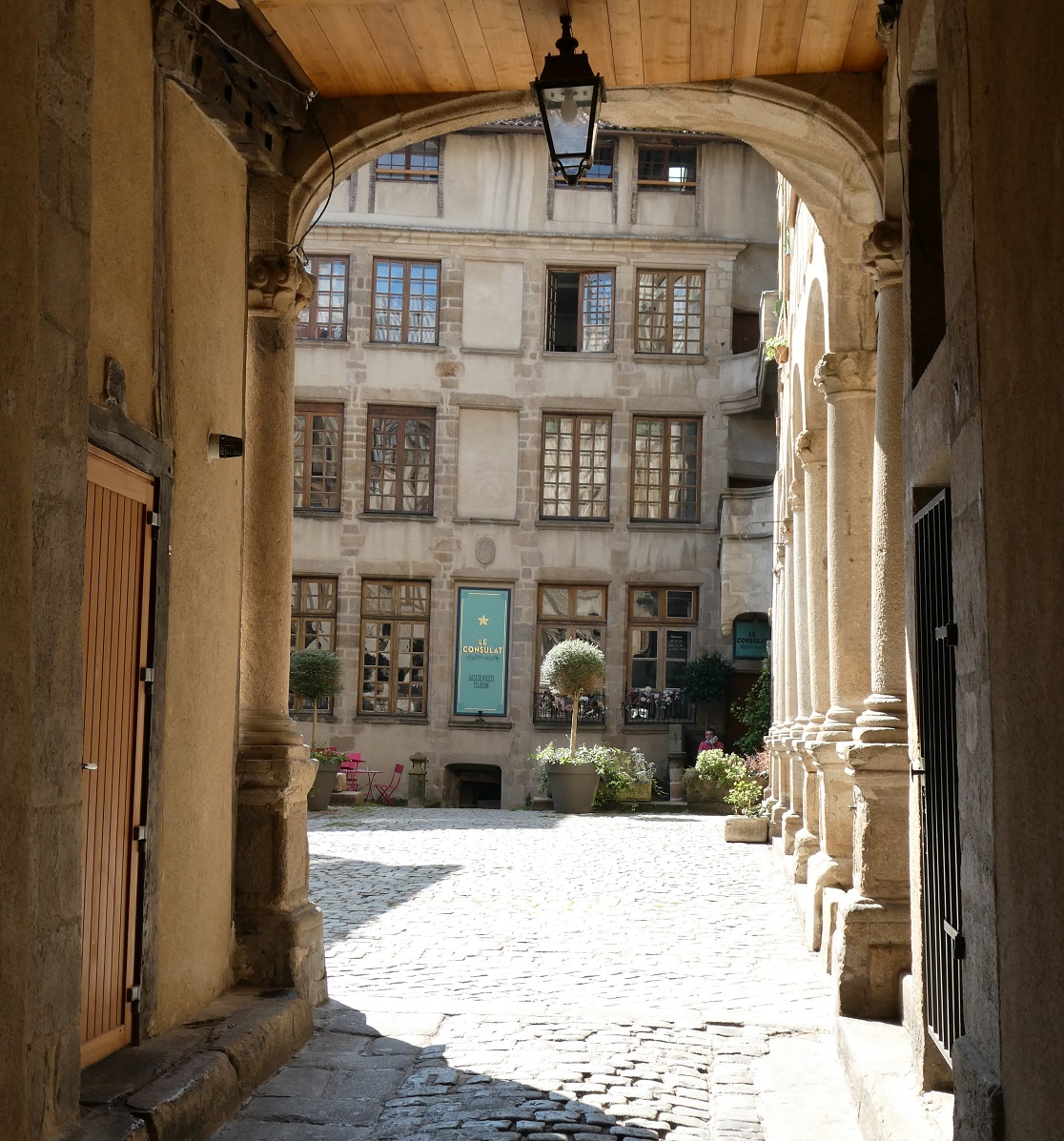 While rue du Temple seemed narrow, we had to turn off from it into an even smaller passageway (photo in 1st paragraph) to get to our next destination. This cobblestone courtyard, Cour du Temple, is surrounded by tall, half-timbered houses with a stone arched arcade downstairs filled with shops. This neighborhood’s church, Église Saint-Pierre-du-Queyroix, is considerably larger than the chapel Saint-Aurélien and features stained glass windows from the 1500s.