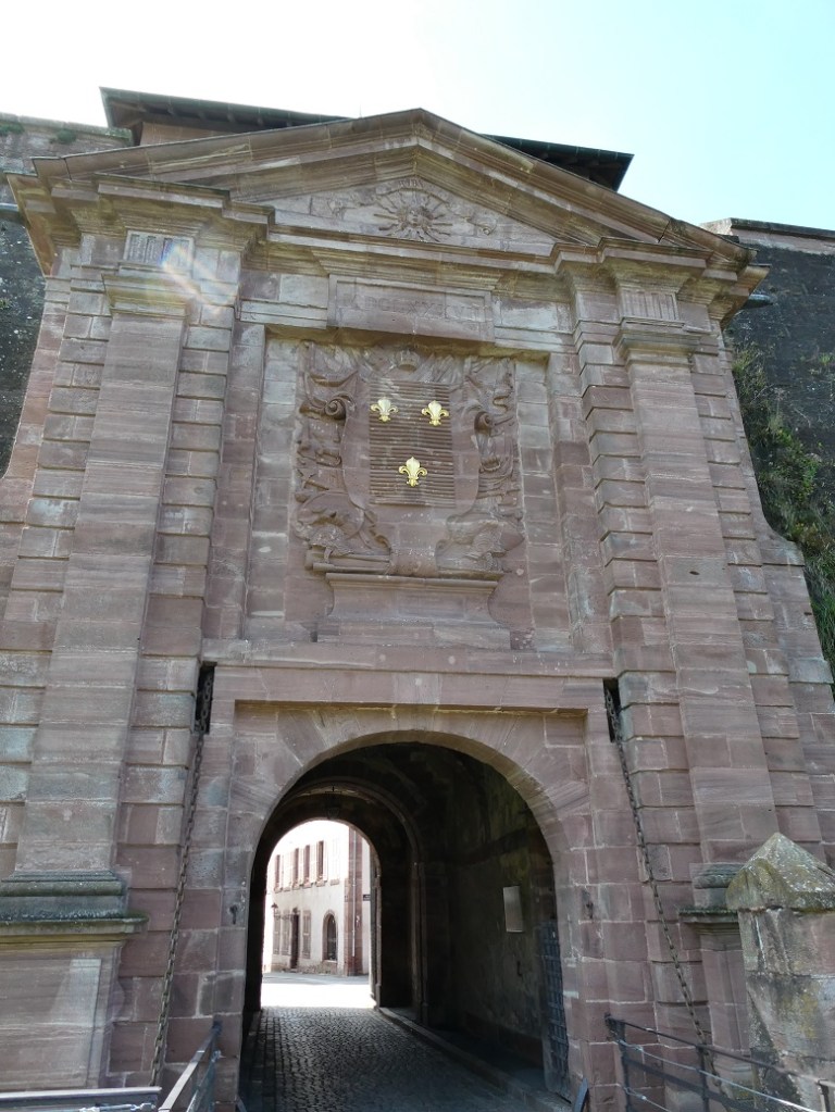 One of those Vauban leftovers from 1687 is on the eastern entrance to the city at the Porte de Brisach which was a gateway into the fort. To gain access to the oldest part of the city we first passed through a portal, walked a narrow curving path lined by thick stone walls, crossed a bridge over a wide ditch, and through a second massive gateway. It was here above the entrance that we could see the emblem of Louis XIV, the Sun King, who ruled from 1643 until 1715.