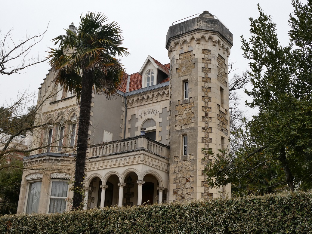 Feeling a bit like Lucy and Ethel in Hollywood with their Movie Stars’ Homes map, we set off to explore the neighborhood except in our case the “stars” were indeed the homes. The tourist brochure (pdf link below) mentions several especially extravagant mansions, all with names, and many in a Spanish style such as Teresa, Toledo, and Trocadero. The one called Brémontier, built in 1863 reminded us of Maison LaMourelle built in Carcassonne in 1911, photo comparison below. We could only admire these villas from the outside since they are private homes but I did see listings for holiday rentals in the vicinity.