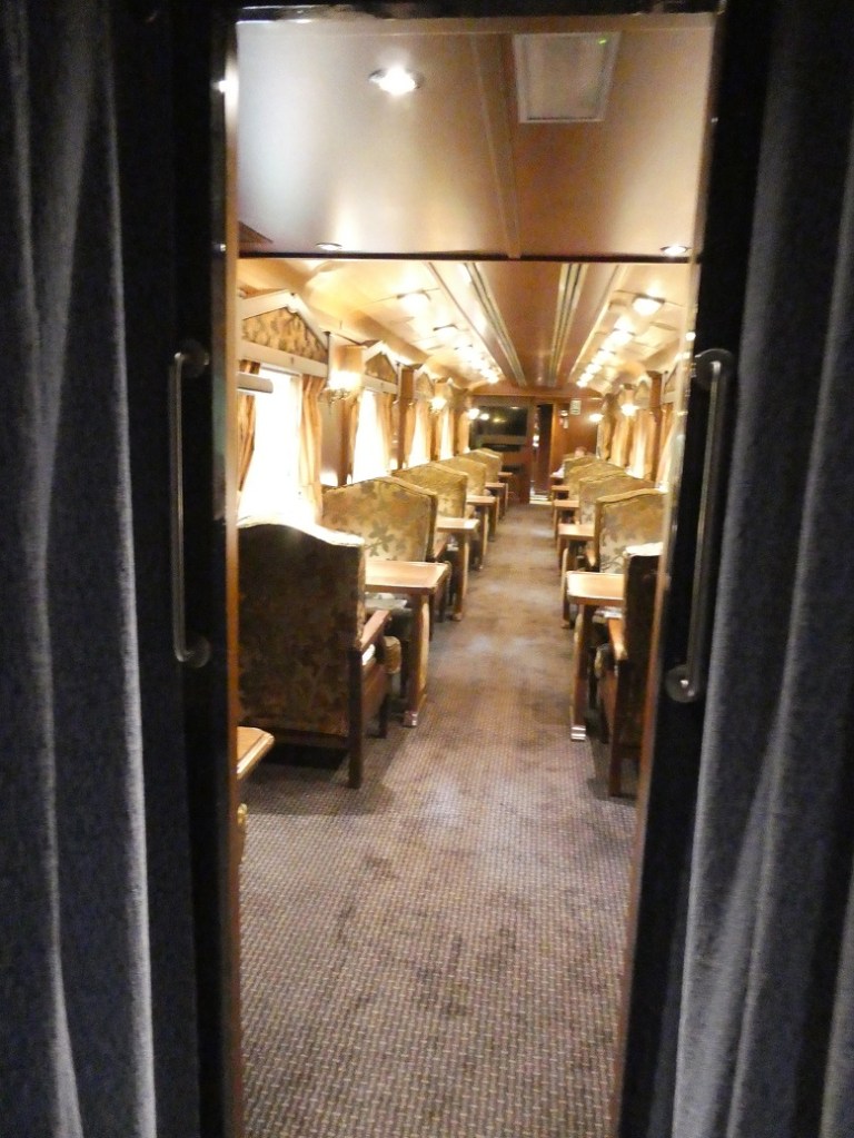 Bill and I have talked for years about taking the Venice Simplon-Orient-Express on its classic journey from Paris to Venice. What could be better than the advertised “Romance, glamor, adventure and the mystery of the past?” Well, to experience all that for more than one night would be great as would a bathroom in your cabin, but those are at the end of your car; and a shower, but that doesn’t exist except inside the Grand Suite. That’s why we jumped at the chance to spend a week crossing the top of Spain on a train built around the same time and in a similar style to its more famous cousin but with en suite bathrooms that have steam showers. Here are views from both ends of our cabin: