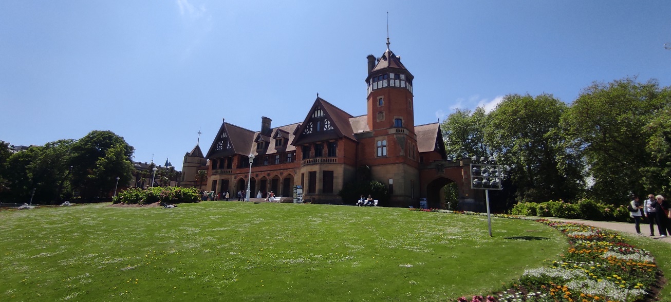 Our first “stop” of the day was more of a stroll as we walked the kilometer-long seafront that is lined with Victorian-style ironwork (featured photo at the top) on the bayside and sometimes matching high rise architecture on the other. A surprise awaited near the western end of the beach in the form of a summer palace in an English Tudor style. It was opened in 1893 when members of the Spanish royal family began vacationing there, welcomed by the Habsburg coat of arms, a part of their family tree. It’s now used as an events center but the gardens are still maintained as if royalty lived there so we enjoyed the greenery and the views over the sea.