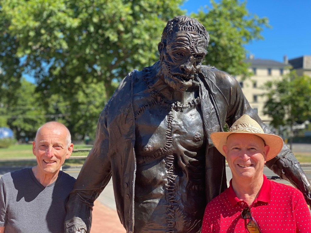 You might remember that much of the novel Frankenstein by Mary Shelley takes place in Geneva. At one point in the story the young scientist’s creature flees the city and heads into the surrounding mountains for refuge. As if frozen in time in the Plainpalais neighborhood where he was created, there is a 2.4 meter (7.9 foot) tall, scary looking bronze monument of the “monster” on his way to escape. Here in Pete’s photo you can see how he towers above us.