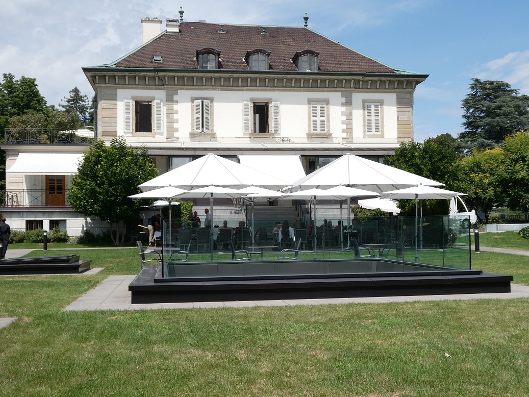 During the first part of our visit to Geneva, we had spent most of our time on the eastern and southern shores of the lake, so we crossed the bridge for the day. We’d been to the United Nations in New York and now we wanted to see its equivalent at the Palais des Nations (photo on the left) where 25,000 delegates meet each year. We didn’t have time for a guided tour indoors because within the Palais park grounds we wanted to see the Ariana Museum that houses thousands of examples of glassware and ceramics from the Middle Ages through the 20th century and to have a school lunch.