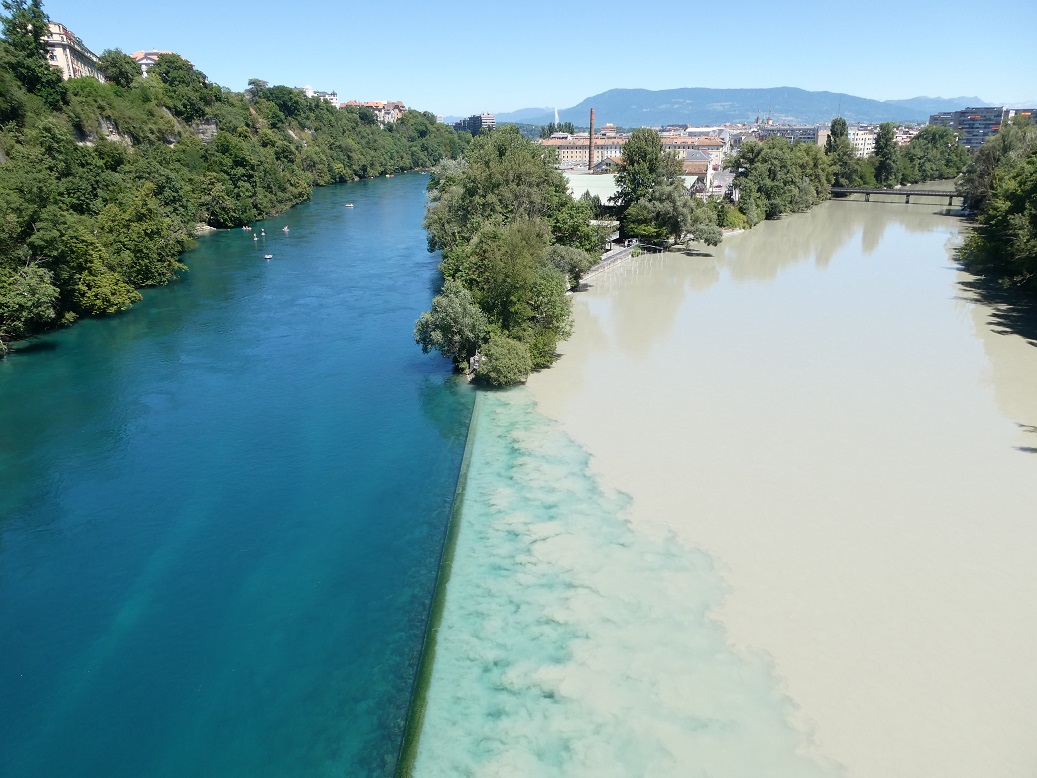 To finish off our time in Geneva with something a little different we took tram #14 to the Jonction stop to see the “junction” where the Rhône River meets the Arve River. Because they are each a different color and traveling at different speeds, their mingling creates an interesting effect. It’s best seen from the railroad bridge over the water which we accessed by a footbridge over the Arve and then a winding uphill pathway through the park Bois de la Bâtie.
