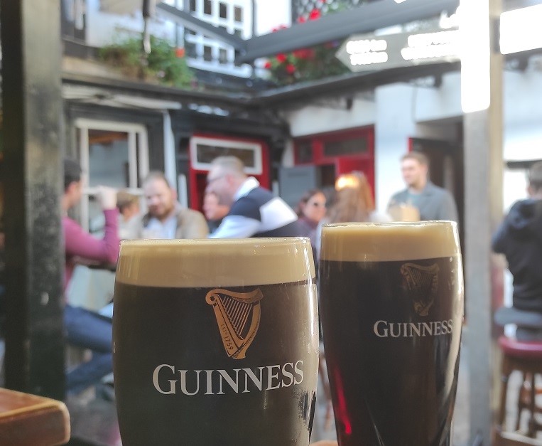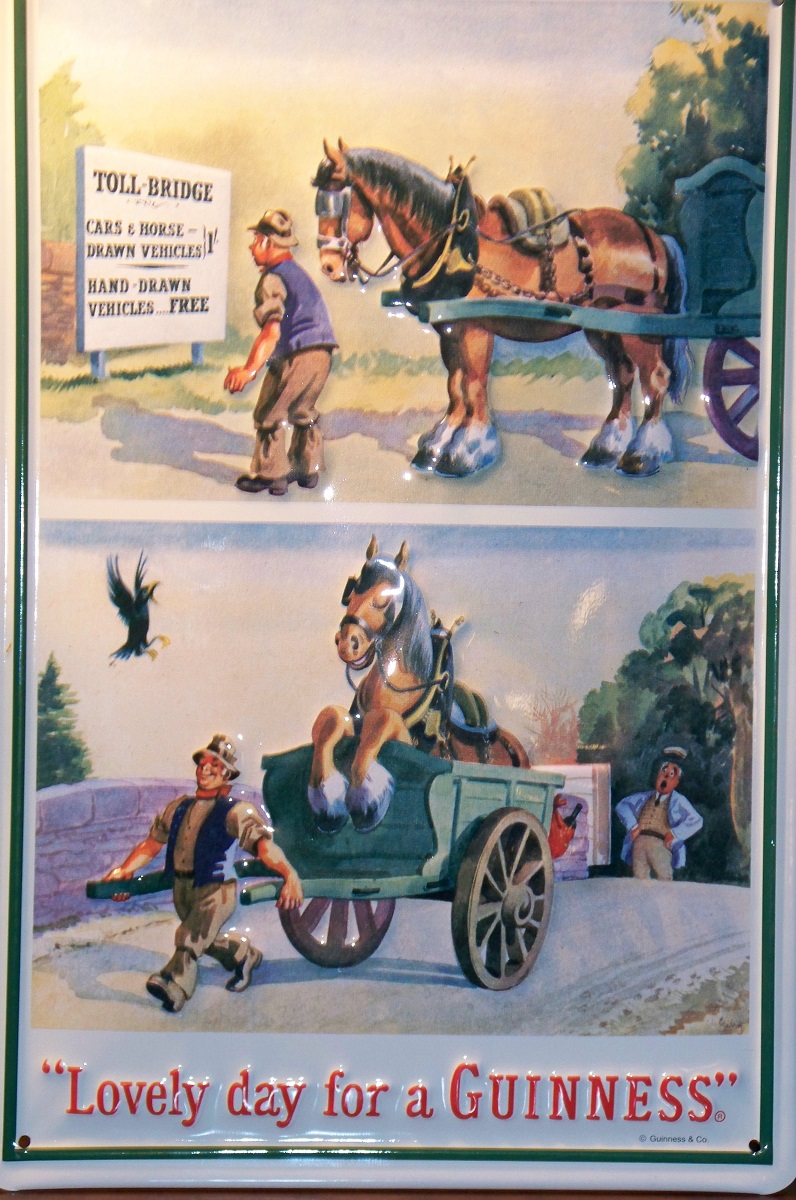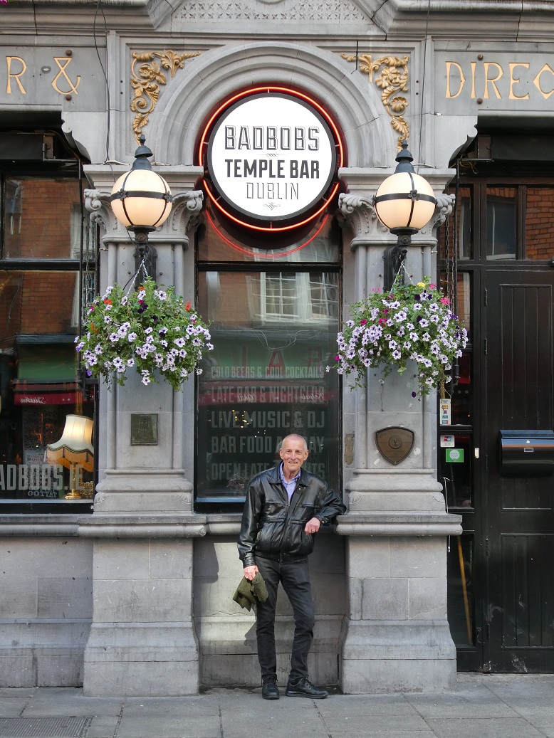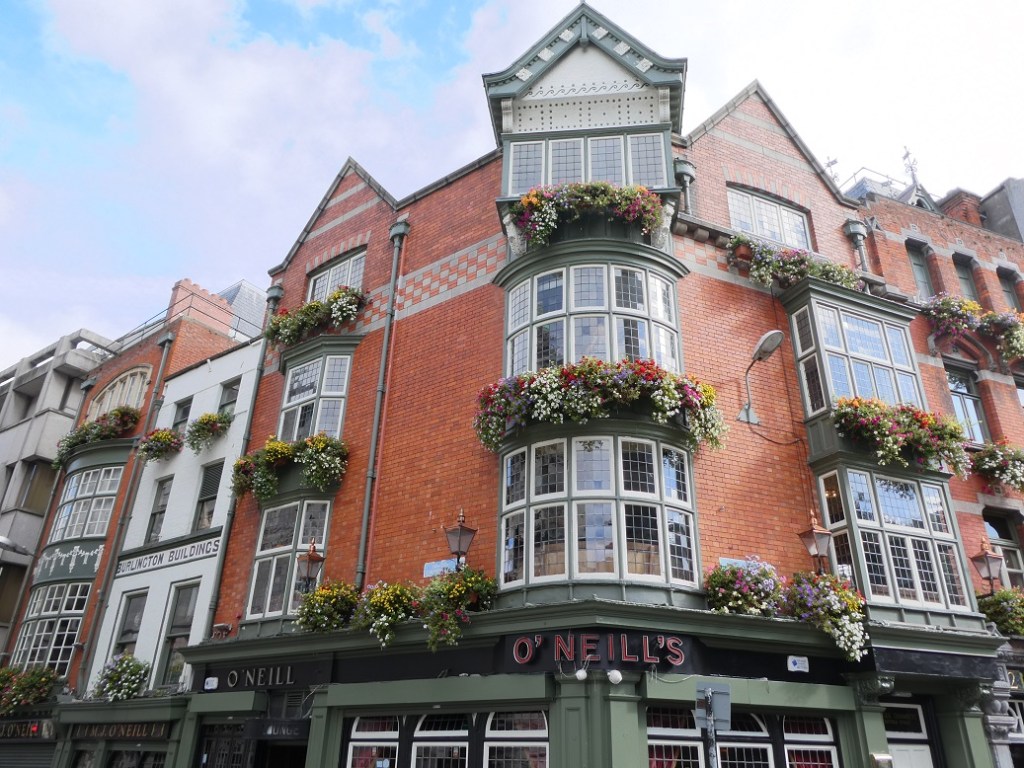 We next encountered the Ha’Penny bridge referring to the half-cent toll that was charged to cross this graceful iron bridge constructed in 1816. That led us across the Liffey to the city’s “party district”, Temple Bar, with at least two dozen pubs in a small area including one called “Bad Bob’s”! Near there is the larger-than-life statue of Molly Malone, the heroine of Dublin’s unofficial anthem “Cockles and Mussels”. It was then an easy walk to Trinity College that has been educating students since 1592 and where on an earlier visit we had seen the Book of Kells, the 1000-year-old beautifully illuminated manuscript. Lunch was in the neighborhood at O’Neill’s Pub and Kitchen where fish and chips were 15€ and a pint of Guinness was 6€.