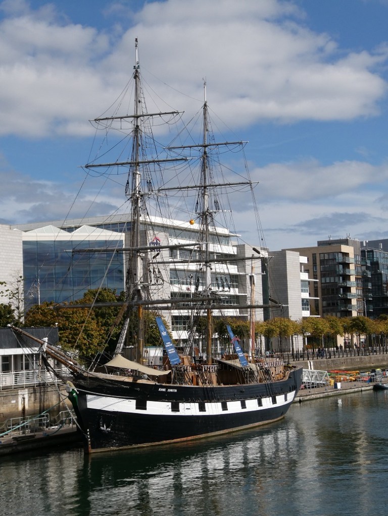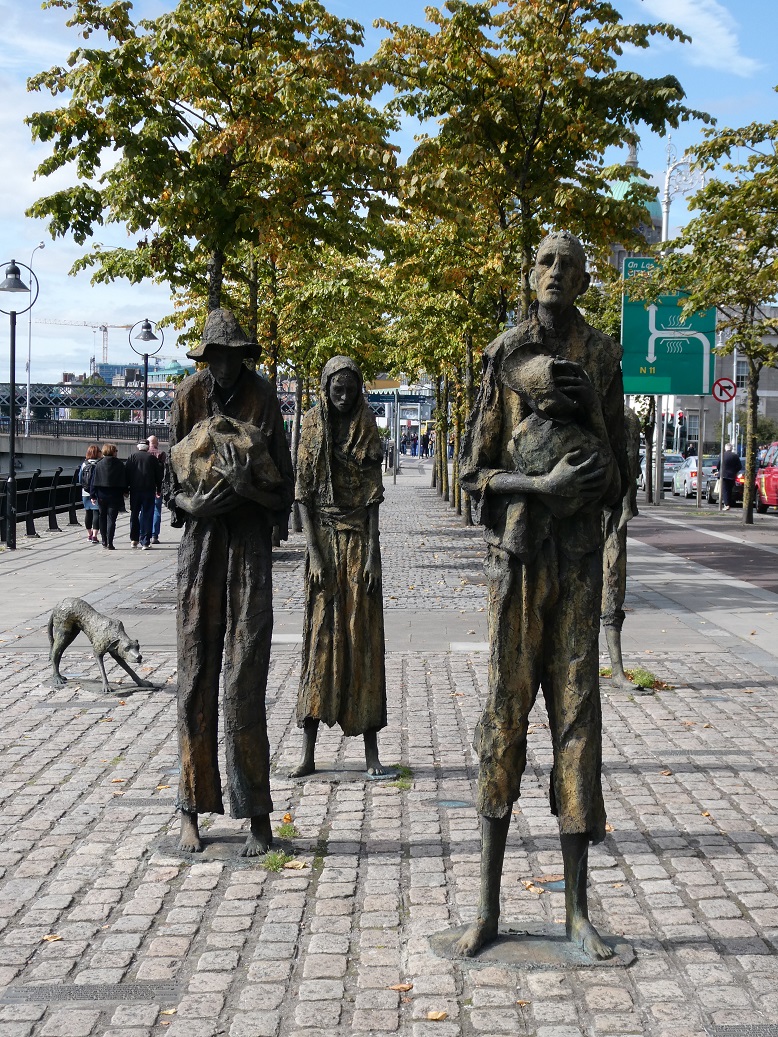 The Liffey River runs through the heart of Dublin and without venturing further than 10 minutes from either bank, we had a full day’s worth of activities lined up. Our idea was to take the Red Tram Line as close as possible to the furthest point on our itinerary and then walk back towards the center of town. That made our first stop the docklands where a life-size replica of the Jeanie Johnson is moored. The original tall ship helped transport thousands of people to North America who were fleeing the famine from 1848 to 1855. The nearby Famine Memorial displays haunting statues representing the million people who died of starvation. I found it a hopeful sign that in the distance behind these images of devastation we could see the Samuel Beckett bridge (featured photo above) in the shape of a harp, Ireland’s national symbol showing that the country has survived.