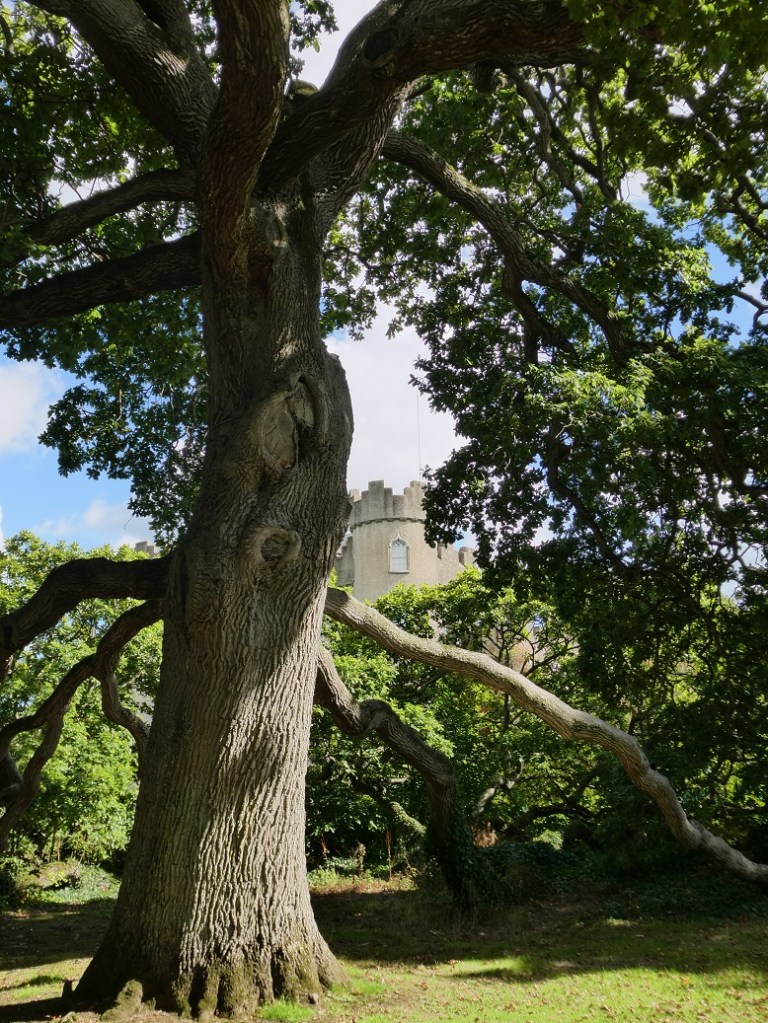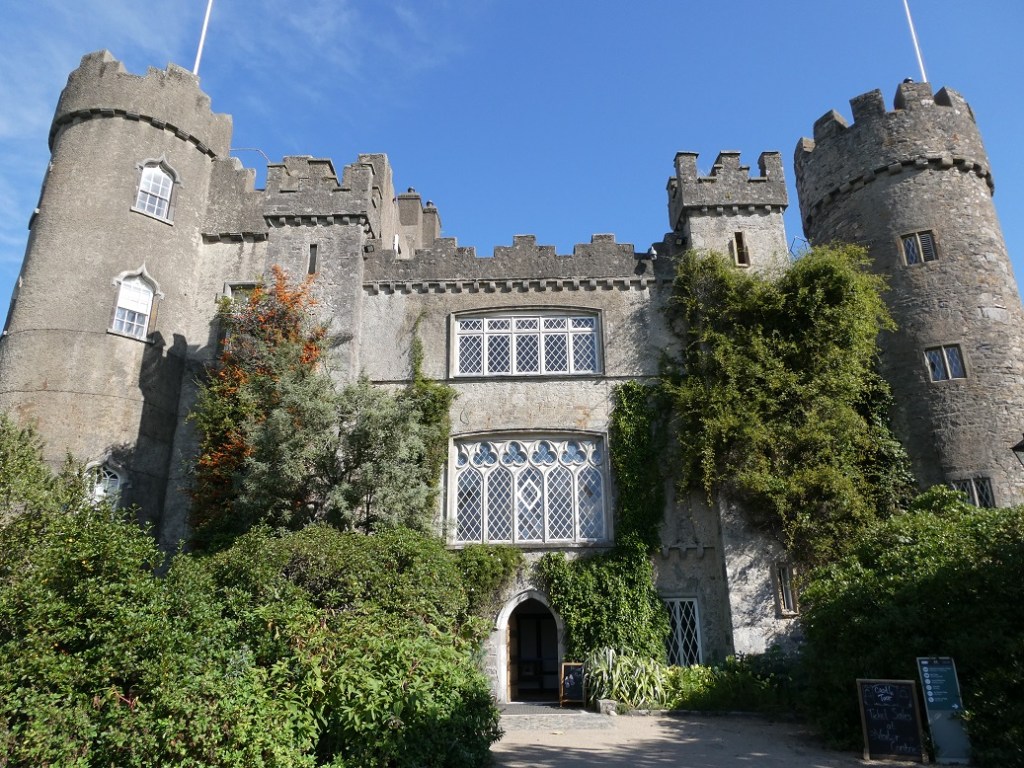 With our intown rambling complete, the next morning we took the train north for 30 minutes to see where, in 1185, King Henry II had given Richard Talbot the lands and harbor of Malahide for his services to the crown. It was there that the family stayed for the next 800 years until the last surviving relative sold Malahide Castle in 1975 to the Irish State who opened it to the public. During the required 45-minute guided tour, we saw several bedrooms, two drawing rooms, the Oak Room named for the 16th century carved panels that cover the walls, plus the medieval Great Hall. (The second photo gallery below has several images from our day out.) Our 9€ Senior ticket also allowed us access to the 20 acres of open grounds plus the Walled Garden and Butterfly House.