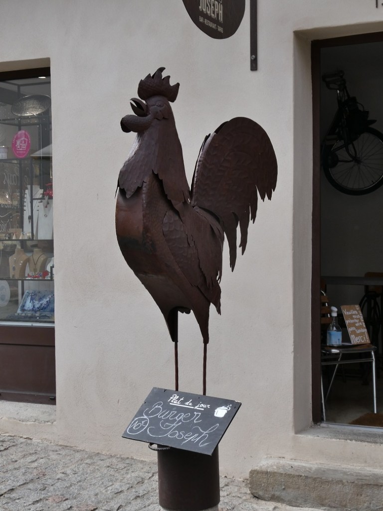 Photo notes, both in Carcassonne: The featured photo across the top is a colorful pop-up shop and in the first paragraph is a rooster, one of the many symbols of France, in front of the restaurant Maison Joseph.