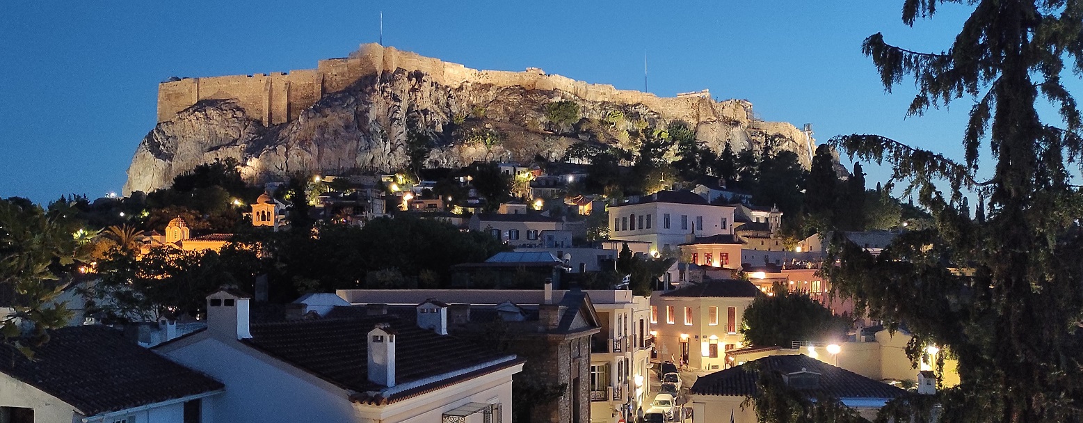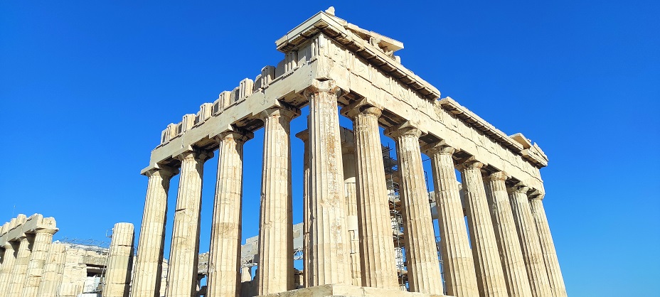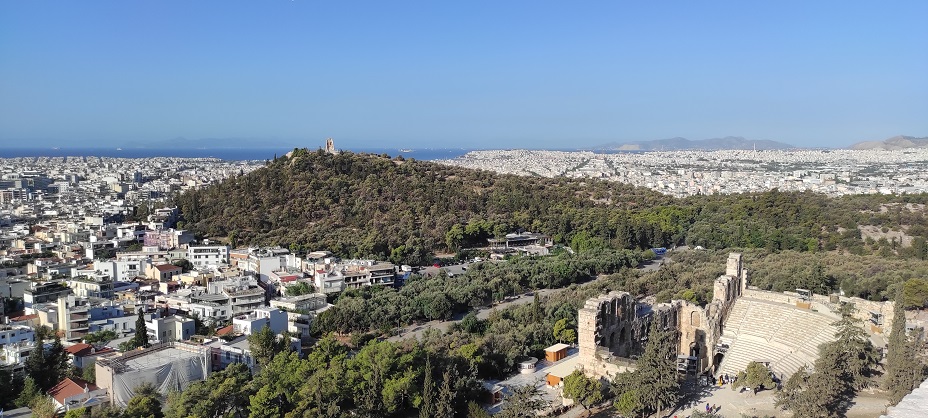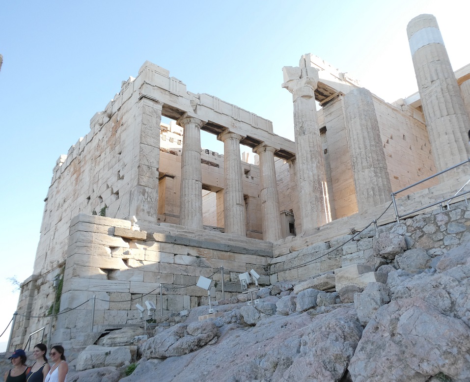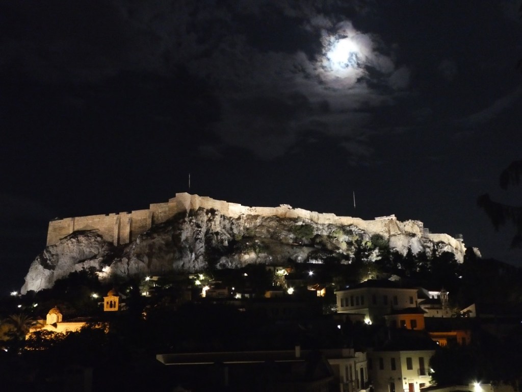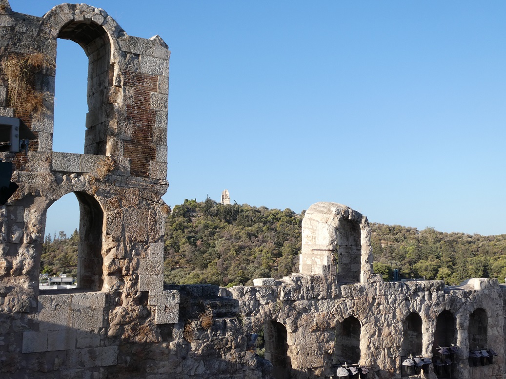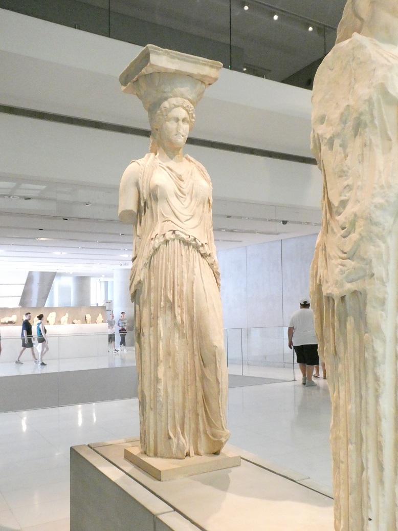The daily schedule that worked for us was to have the morning for sightseeing, lunch at an air conditioned (!) restaurant or at least with a shady patio, and then dinner on our balcony with that beautiful view of the Acropolis you see across the top of today’s blog post. Hoping to beat the heat and the crowds we arrived at the 8:00 AM opening time of the “hill of the gods” and after an hour and a half we were ready to move on. We had all listened to an audio tour in advance that prepared us to appreciate seeing the multi-columned Parthenon, the 6 female statues supporting the roof of the Erechtheion, the Propylaea gateway, the Temple of Athena Nike, and the two theaters with Dionysus considered to be the world’s oldest stage.