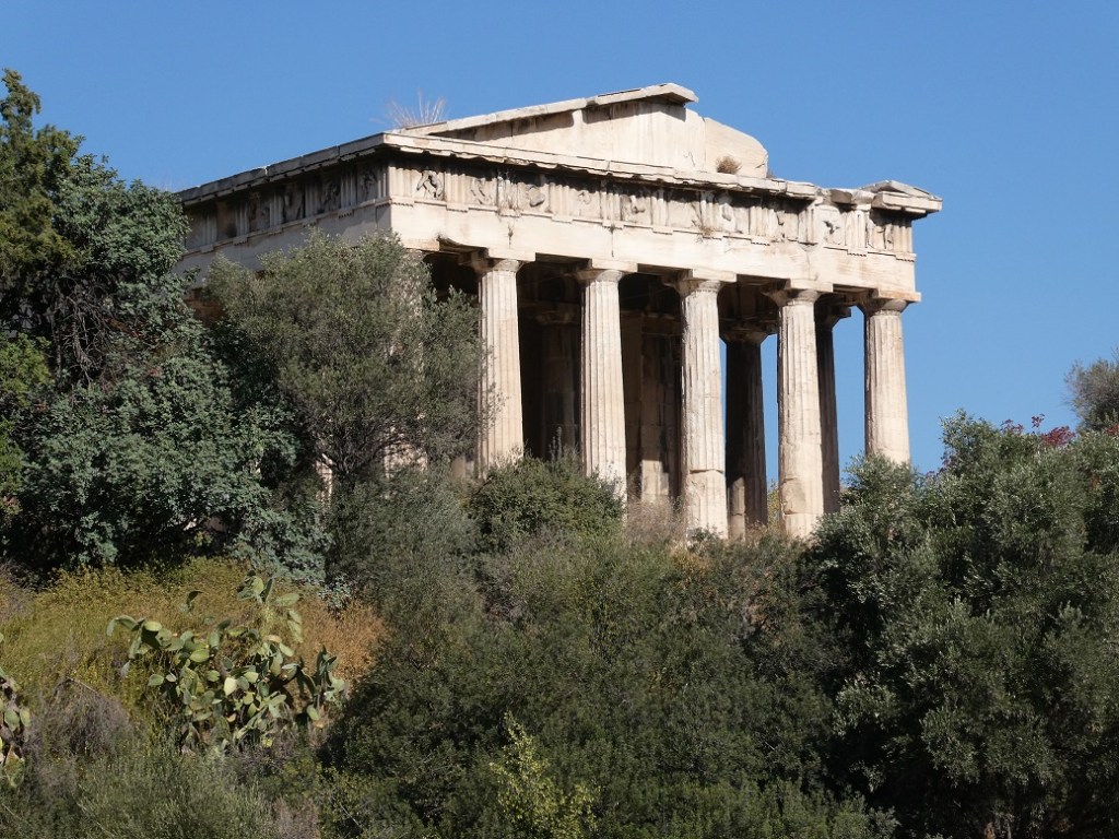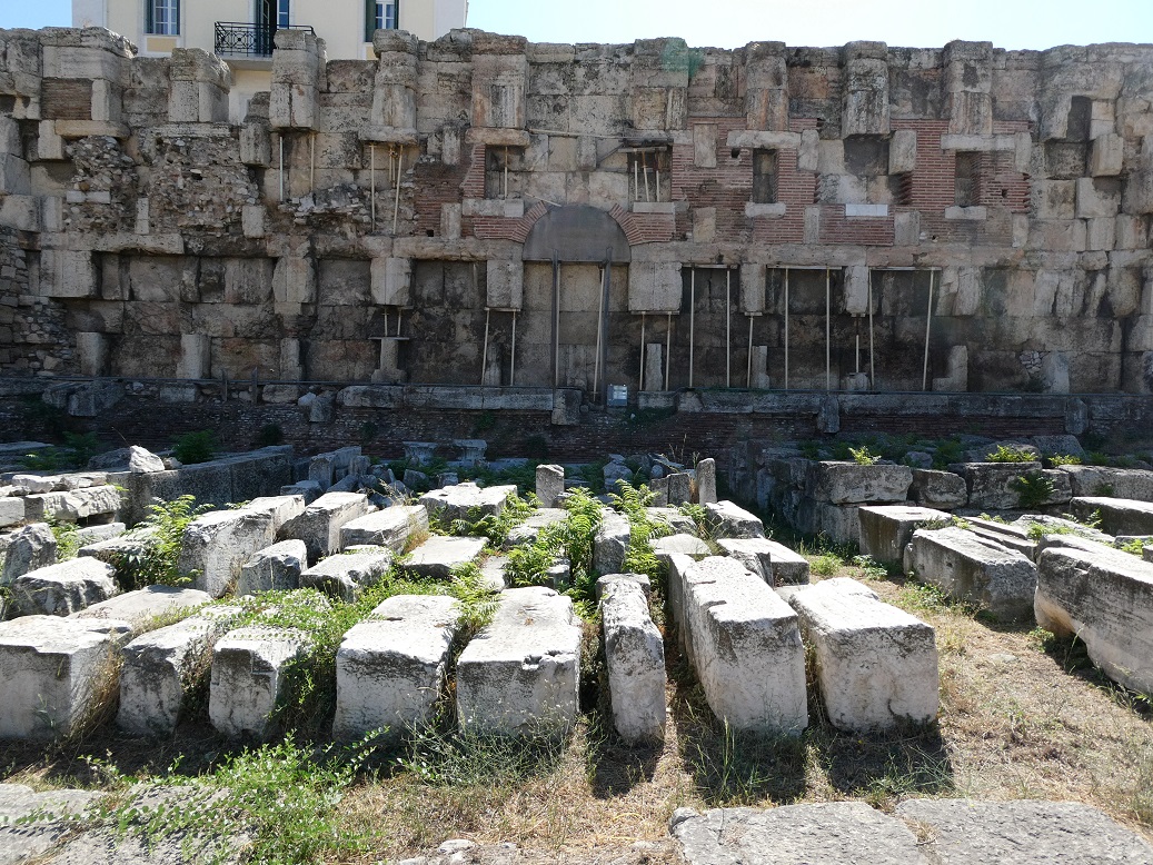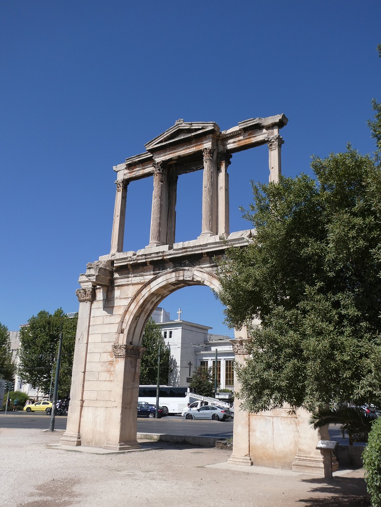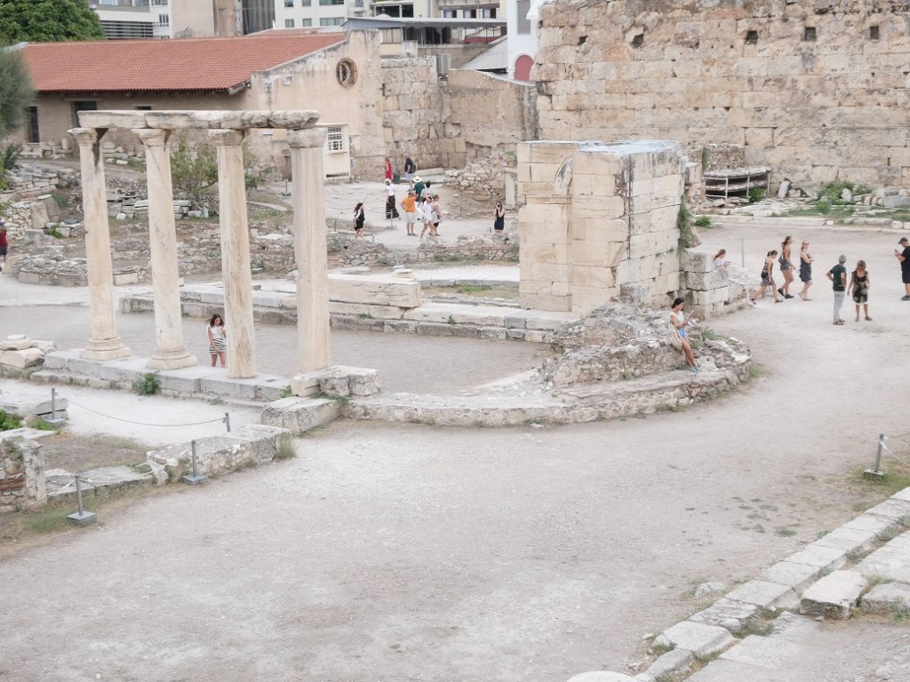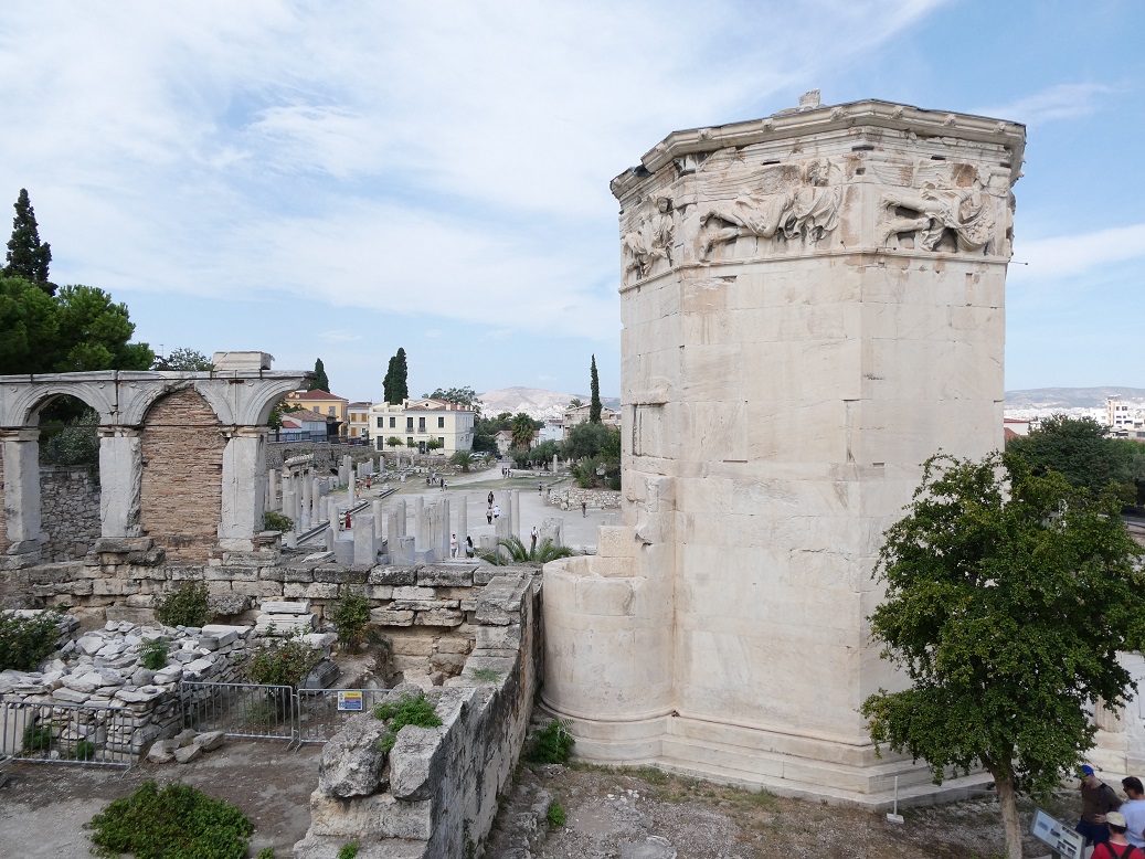 The word “agora” can generally be translated as a “public space” used for social, political, religious, commercial, and cultural activities, a market place, or a covered walkway. That was our concentration for the next day with both the Ancient and the Roman agoras. The former, starting around 600 BC, is a collection of buildings including a temple, a stoa (a colonnaded, covered walkway), an altar, and the headquarters for the city council. The Romans built their agora 500 years later and it mainly served as a marketplace and a civic center, with shops, offices, a fountain and public toilets. Around that same time period and essentially next door, Roman emperor Hadrian had his library built to house at least 17,000 rolls of papyrus books. While those disappeared long ago due to fire or decay, we could still see the outer wall, the entrance, some of the 100 columns, and parts of the churches that were built inside the library complex.