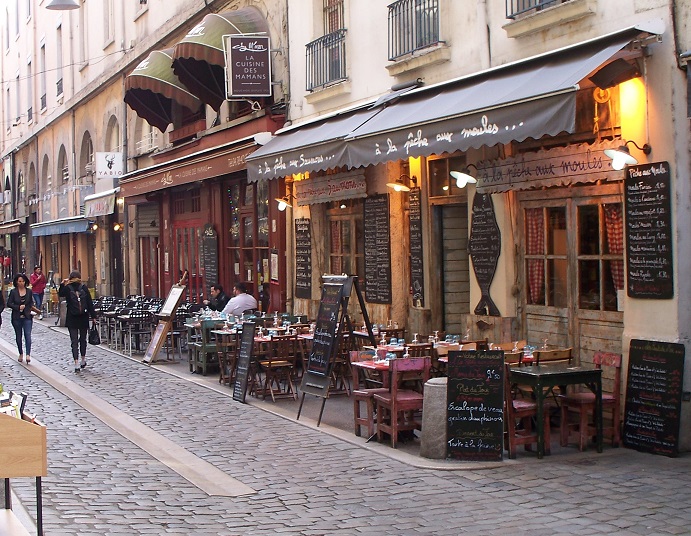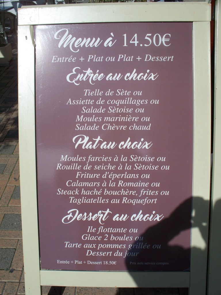 Photo notes: Across the top are tables ready for lunch in Lyon while in the first paragraph is an affordable menu in Sète.