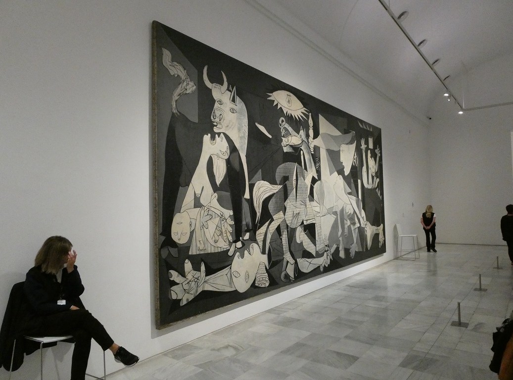 The modern art museum Reina Sofia contains at least 18,000 modern and contemporary art works but the one masterpiece that everyone comes here to see is Guernica by Pablo Picasso (today’s featured photo across the top of this post). It depicts the horrors of the bombing of the Spanish town Guernica during the Civil War in 1937 and is displayed in a room containing sketches and documents that help explain this complex painting.