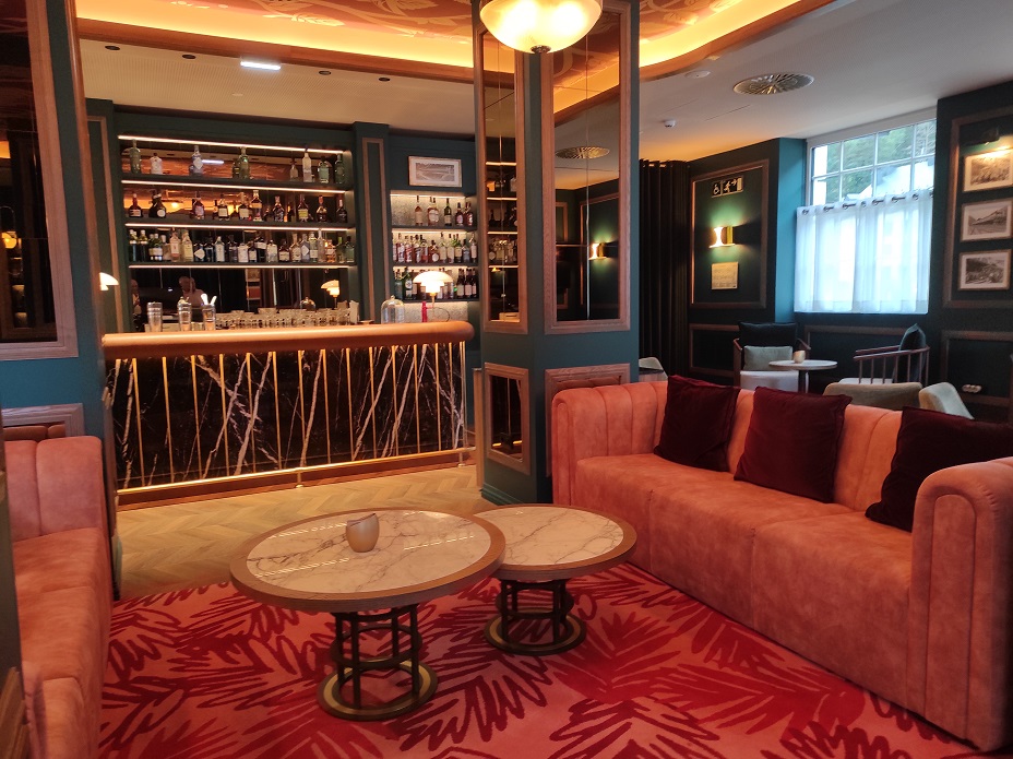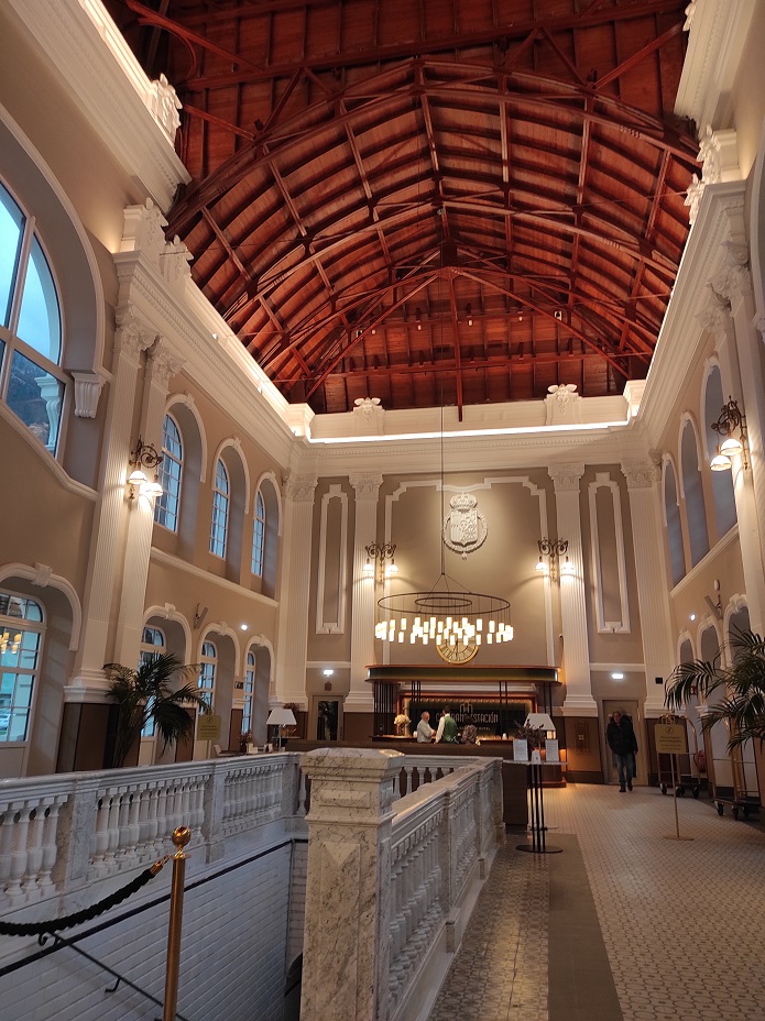 Luckily those tragic times are all now history and Canfranc Station has been beautifully restored as a 5-star, 104-room hotel with some of the original marble floors, chandeliers, and frescos still in place. The staff uniforms reflect the classic look of the 1930s in cream and green just as they would have worn them when the station opened. There are 7 types of rooms—ours was on 2 levels, bedroom up, living room down—all rightfully including the words superior, deluxe, and/or suite in their description. It took 1 minute and 10 seconds to walk from the elevator in the center of the hotel down the hallway you see here to our room. While we were there only one restaurant and one bar were open but restored rail cars from the 1920s sit just outside the station providing additional dining and entertainment options. It’s our guess that once the rail line is reopened from France, projected for 2026, they won’t have any trouble filling the rooms or the restaurants.