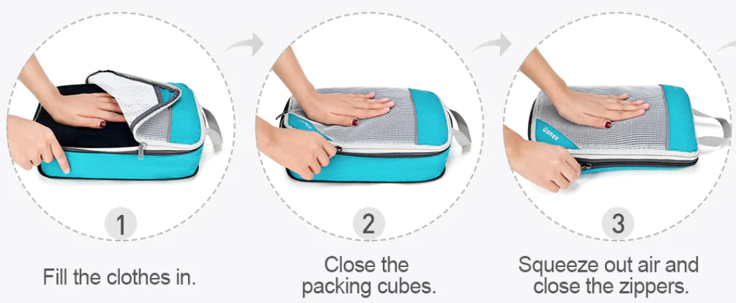 Packing cubes were next and we can definitely agree with this one. Underwear and socks in a smaller one and t-shirts, pjs, a sweater in another. Zip them in and then use the second zipper to compress the entire package. Everything is organized, compact, and at the hotel you know exactly where to look for your items.