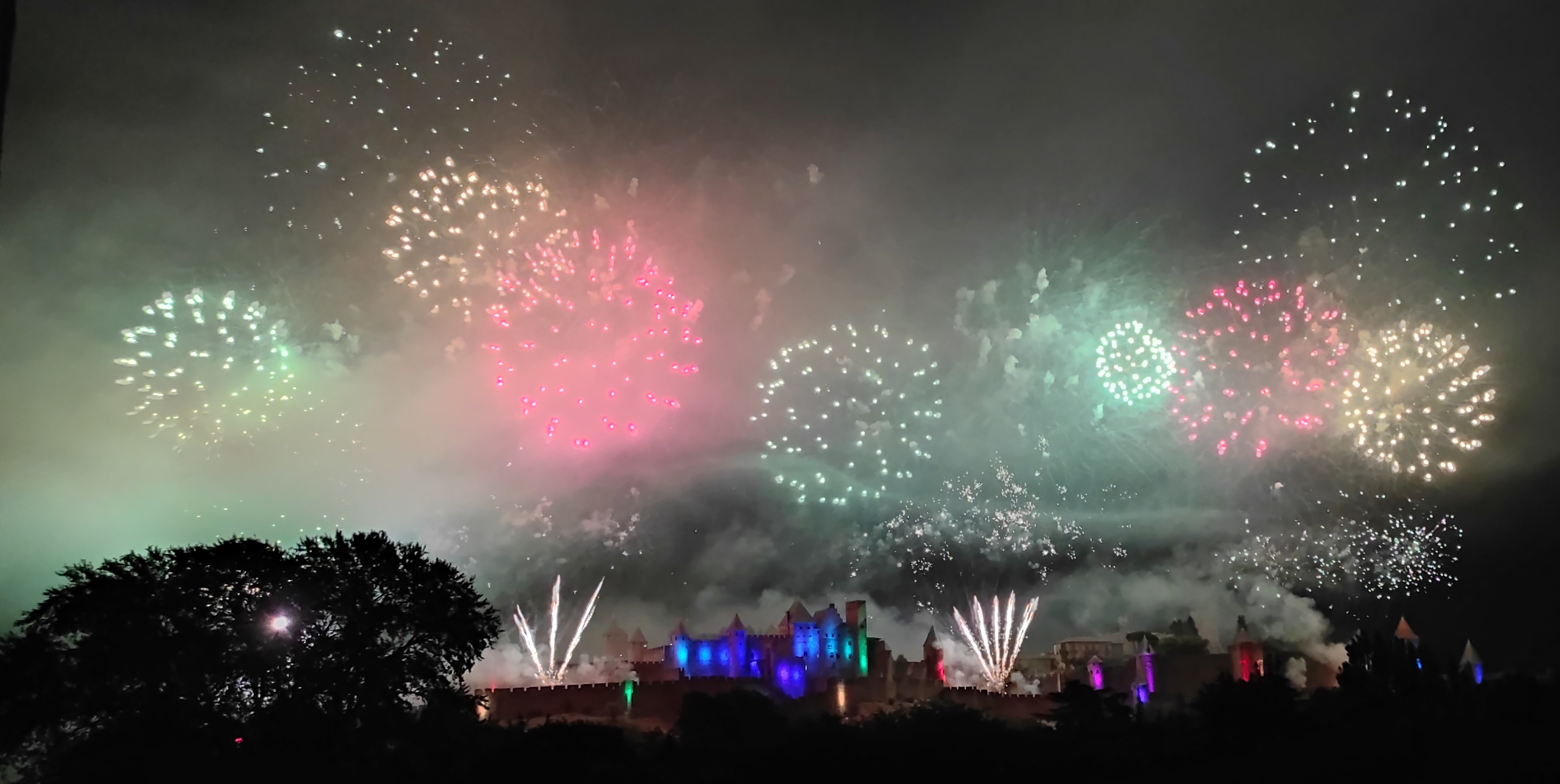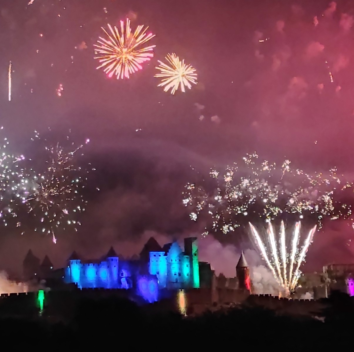 Each year in Carcassonne, July 14 starts with a small parade of soldiers while in Paris it’s a major armed forces event with a big show of military power including jets in formation, la Patrouille de France, similar to the Blue Angels. Later in the day there are picnics and other outdoor parties culminating in a fireworks show—in Paris that’s off of the Eiffel Tower. Here, the big event takes place above the walled medieval Cité. We used to live in the shadow of those walls and towers so not only did we see the 20-minute spectacular display in the sky, we felt the “boom” of every one of those explosions. Although we’ve moved away from those walls, a few hours from now we’ll still be celebrating with our fellow residents the Liberté, Égalité, Fraternité of France!
