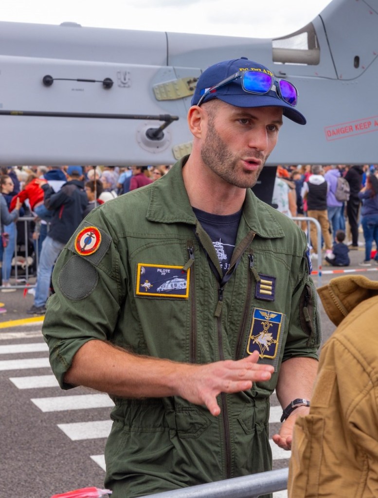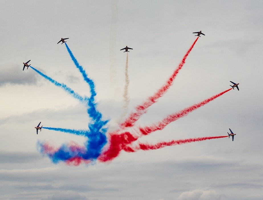 Then everyone moved outside for 6 hours of aerobatics, performed by 40 different aircraft, vintage and modern, from across Europe and the USA, including a plane restored by Pink Floyd’s David Gilmour. While individuals had particular planes that interested them, probably everybody came to see la Patrouille de France, a skilled set of pilots similar to the Blue Angels and the Red Arrows. For 20 minutes they put on a show with intricate formations and maneuvers at high speeds that ended with the sky filled with contrail colors of bleu, blanc, rouge (cover and first paragraph photos).