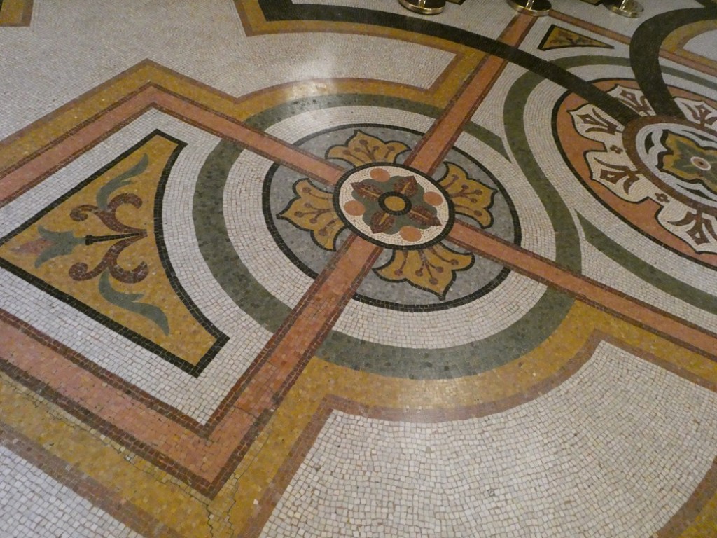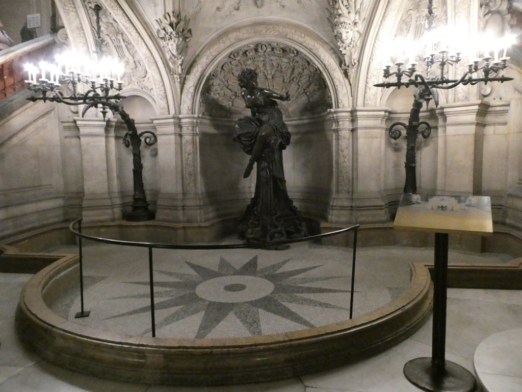 We walked on to the Bassin de la Pythia, a dry marble basin holding a statue of the Greek mythological priestess Pythia. This sits at the base of the Grand Escalier, a lavish split staircase in marble, onyx, and copper beneath a 30-meter high (98 feet) vault. At the top of the stairs we entered the Avant Foyer, a relatively intimate room (given the huge scale of the Opera) where the ceiling is covered in sparkling multi-colored mosaics on a gold background.