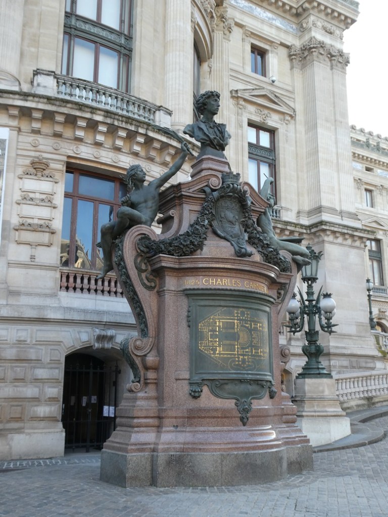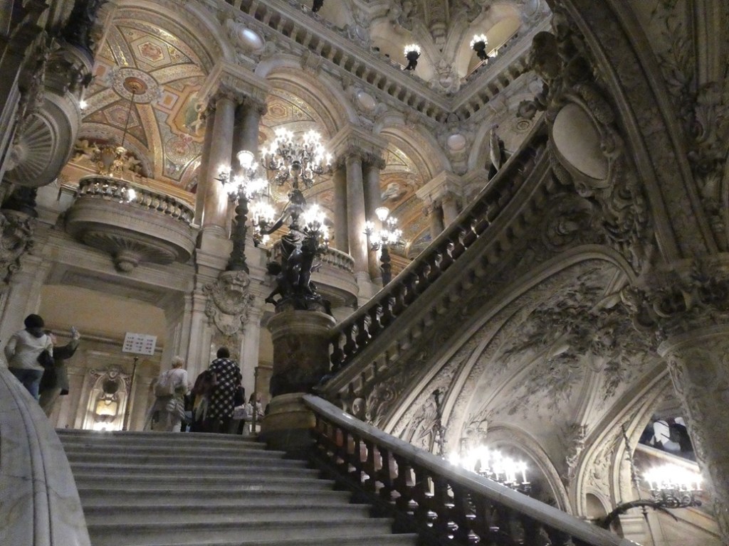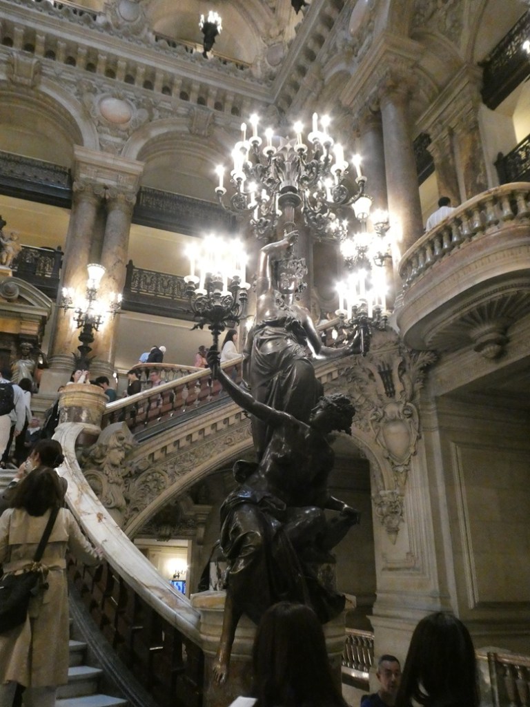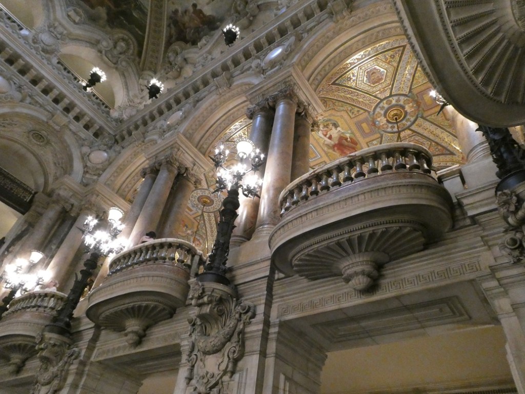 We’re not opera fans so it surprised me when Bill said that he was ordering tickets to the opulent 19th-century Parisian theater, Opera Garnier. We do enjoy architecture, however, so it all made sense when he explained that in planning for a trip to Paris we would now be going on a guided tour inside the beautiful building that we’d admired from the street in front and from the Galeries Lafayette department store rooftop, 8 stories up. Since we would not be attending a performance, I should probably call the theater by its alternative and perhaps more prestigious-sounding name, the Palais Garnier