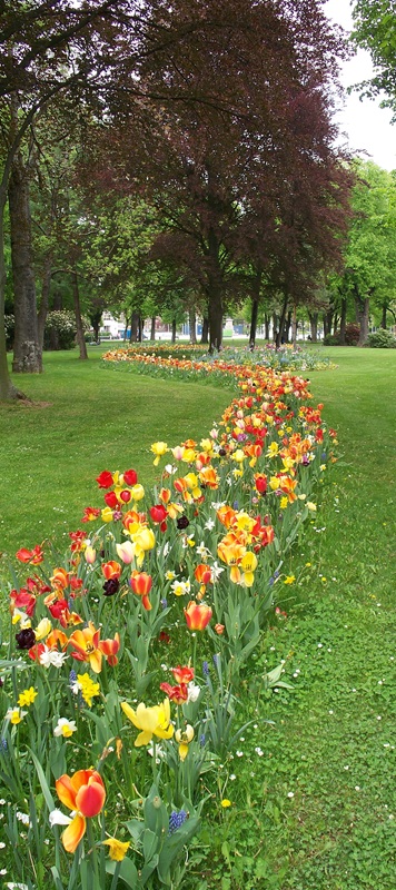 We’ve seen plenty of tulips and other spring bulbs around this country but we haven’t yet visited the fields in Provence or in Brittany. While having your own car would make these visits easy, I see that there is at least one company in Uzès that offers tulip field tours and there is a train station in La Brillane that Google Maps shows as a 20-minute walk from the fields. In the meantime, please enjoy these springtime flower beds that we’ve found around France. Each one has some tulips hidden within while in the Luxembourg Garden in Paris we found that entire bed of purple and pink tulips you see across the top of today’s post.